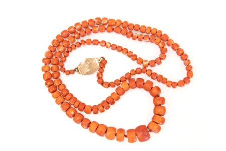 realizzata con fermezza in oro basso, collana degradé con rondelle di corallo naturale