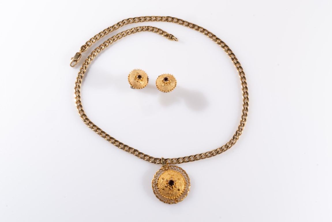 composto da pendente e orecchini lavorati a filigrana sarda con granato centrale, corredati di collana a grumette diamantata non pertinente, orecchini firmati E. Spiga, marchio 750