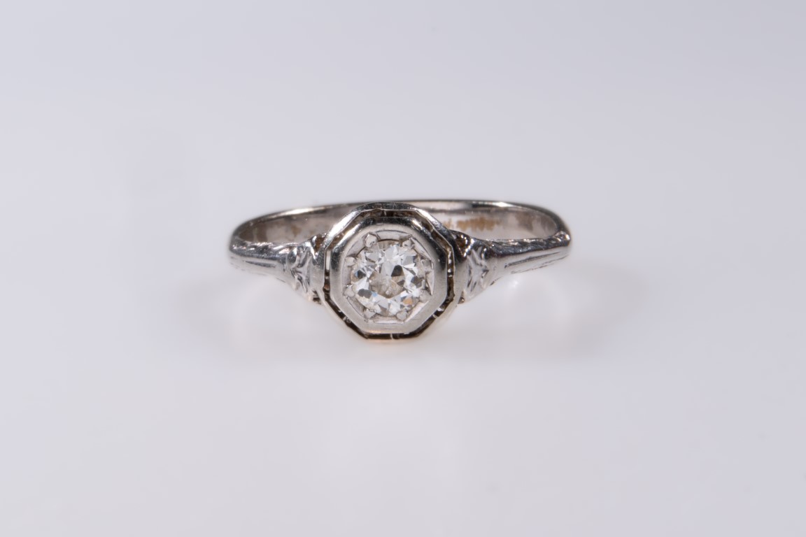 Anello solitario traforato in oro bianco e platino e diamante centrale