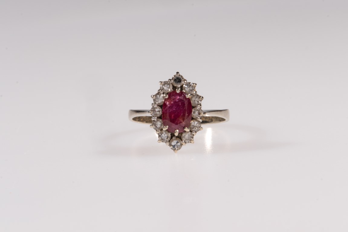 modellato a margherita, diamanti taglio huit-huit, rubino taglio ovale ct 1