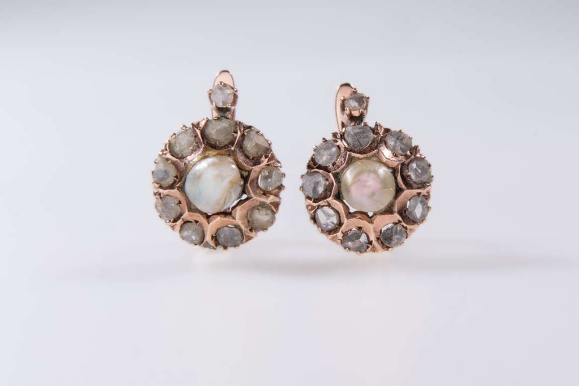impreziositi da 10 diamanti taglio rosetta e una perla centrale a bottone in ogni orecchino