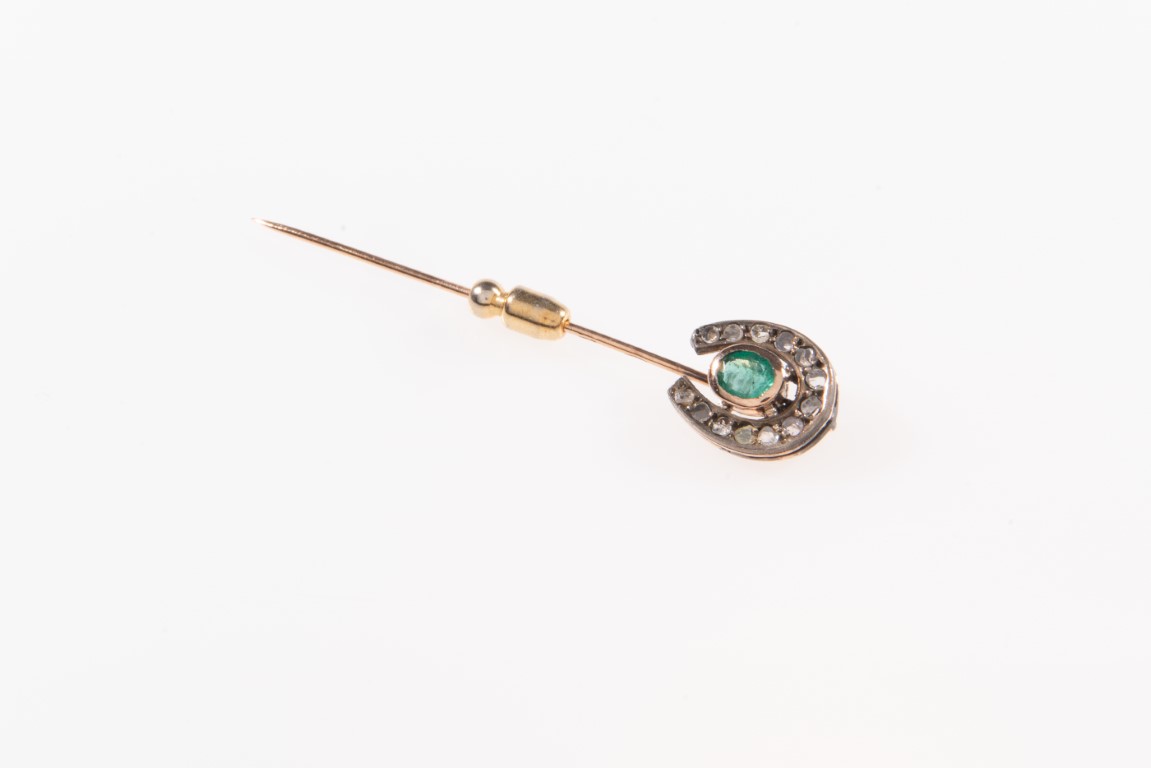 realizzata a ferro di cavallo con smeraldo taglio ovale di circa 0,35 ct stimati e 13 diamanti taglio rosetta