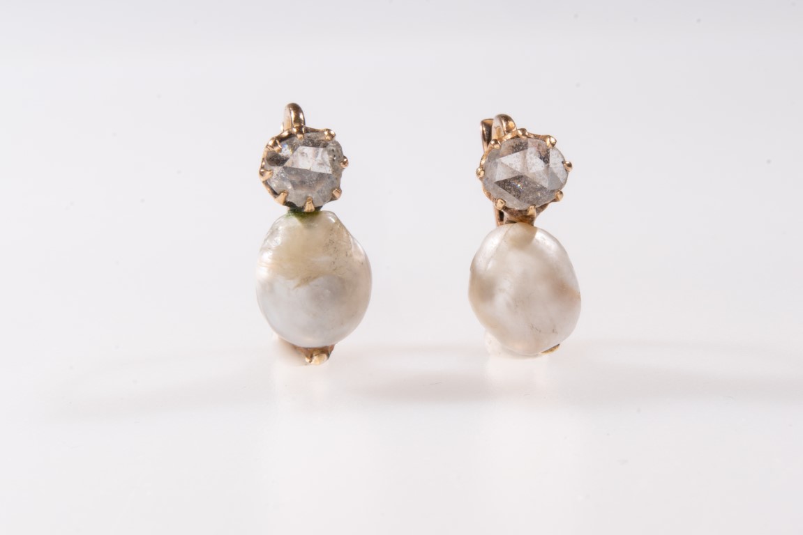 Orecchini in oro basso con perle scaramazze e diamanti