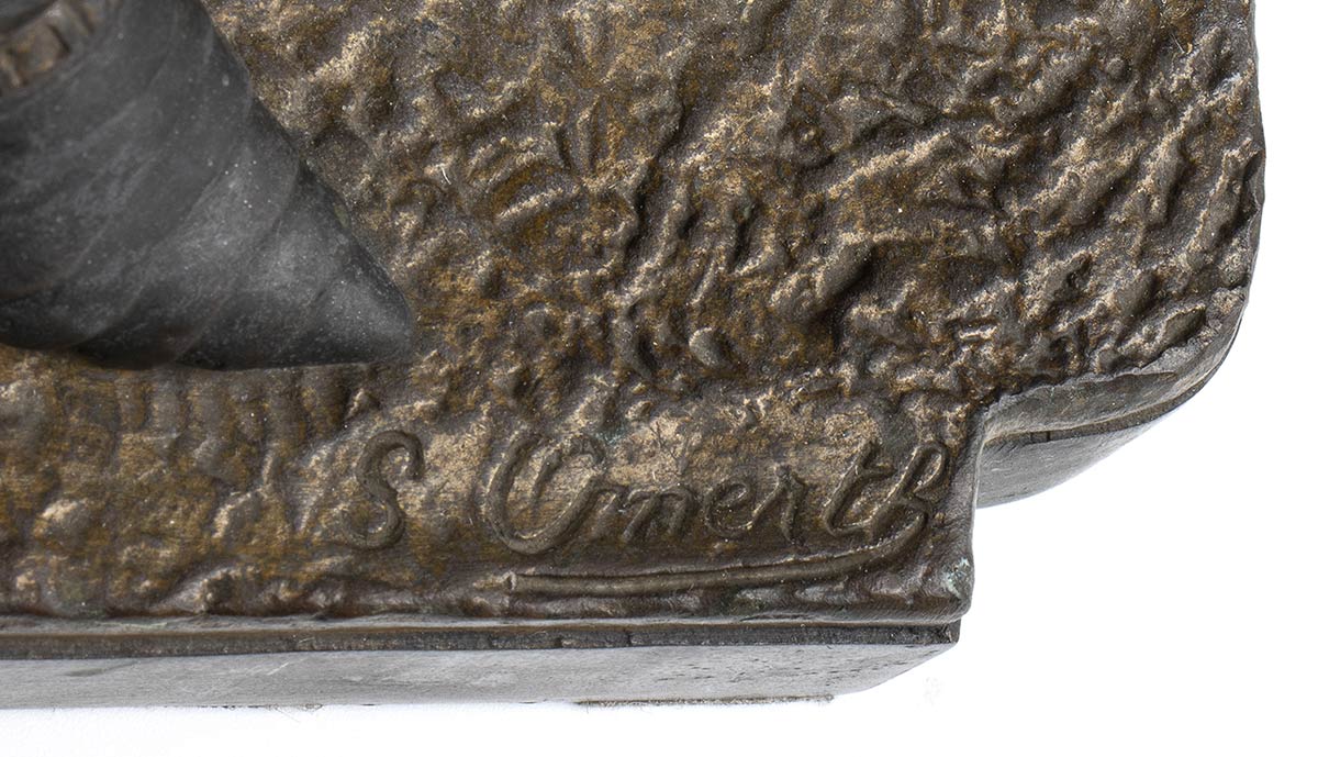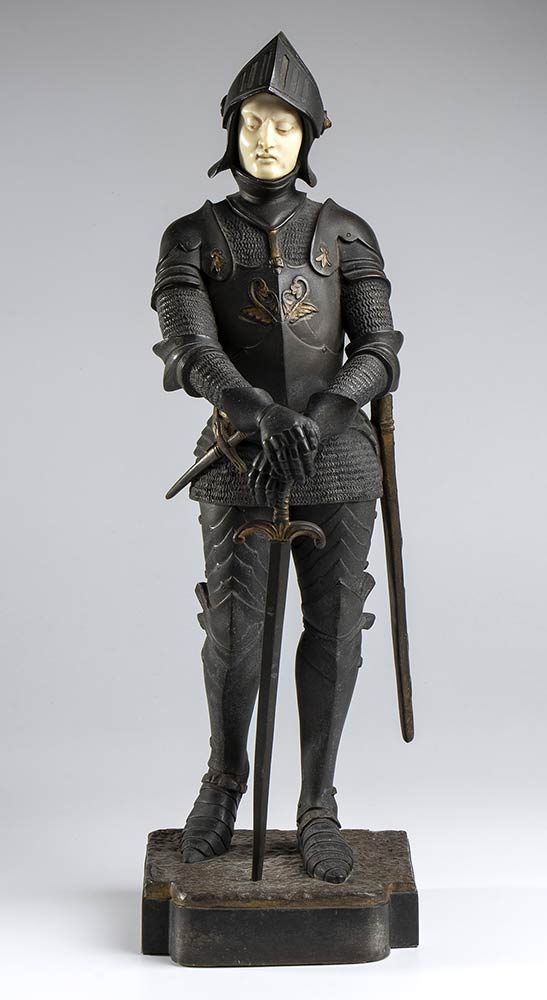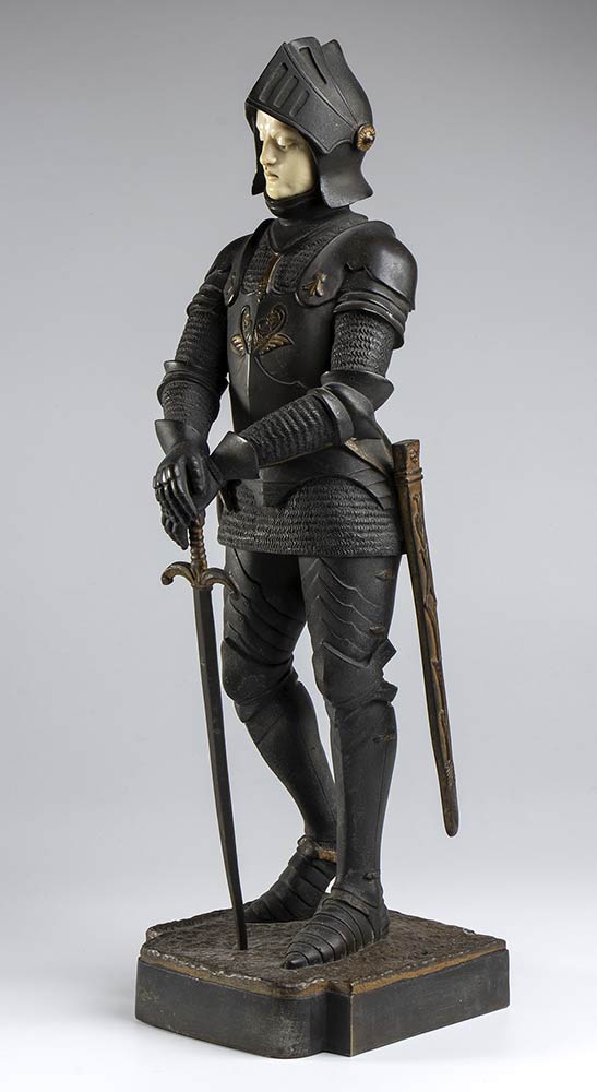 scultura criselefantina art déco in bronzo e avorio raffigurante guerriero in armatura con viso in avorio di elefante (Loxodonta africana Blumenbach, 1797 o Elephas maximus Linnaeus, 1758). Firmata alla base "S. Omerth".