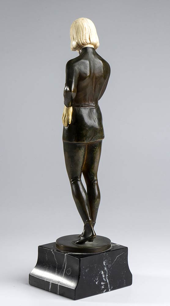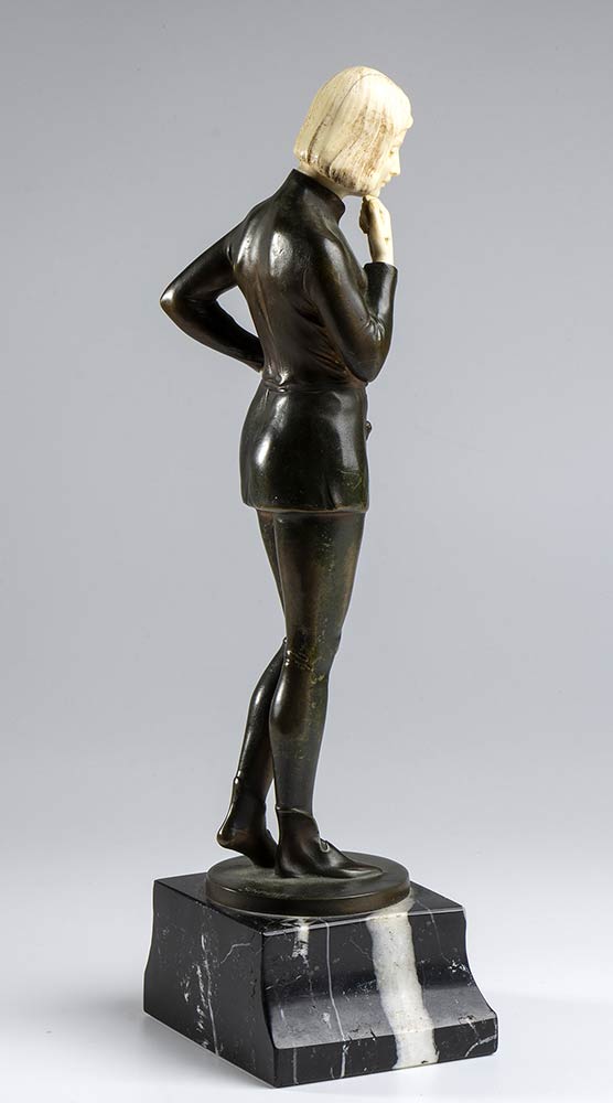 scultura criselefantina art déco raffigurante un fanciullo in abito medievale con un pugnale in vita, con viso e mani in avorio di elefante (Loxodonta africana Blumenbach, 1797 o Elephas maximus Linnaeus, 1758).Base in marmo. Firmata alla base "Schrimpe".