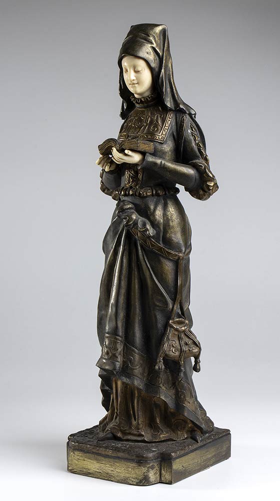 scultura criselefantina art déco raffigurante una dama in abiti nobiliari con viso e mani in avorio di elefante (Loxodonta africana Blumenbach, 1797 o Elephas maximus Linnaeus, 1758). Firmata alla base "S. Omerth".