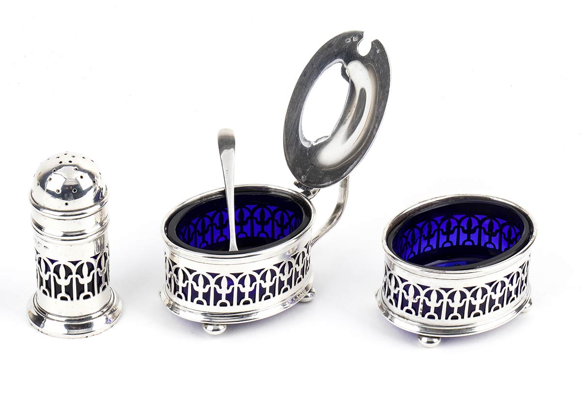 Saliera, pepiera e mostardiera inglesi in argento - Birmingham 1921, maestri argentieri DOCKER & BURN