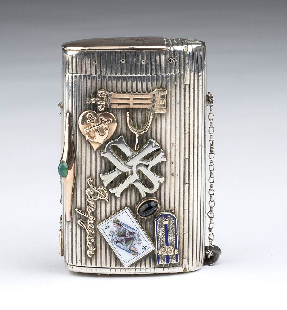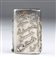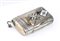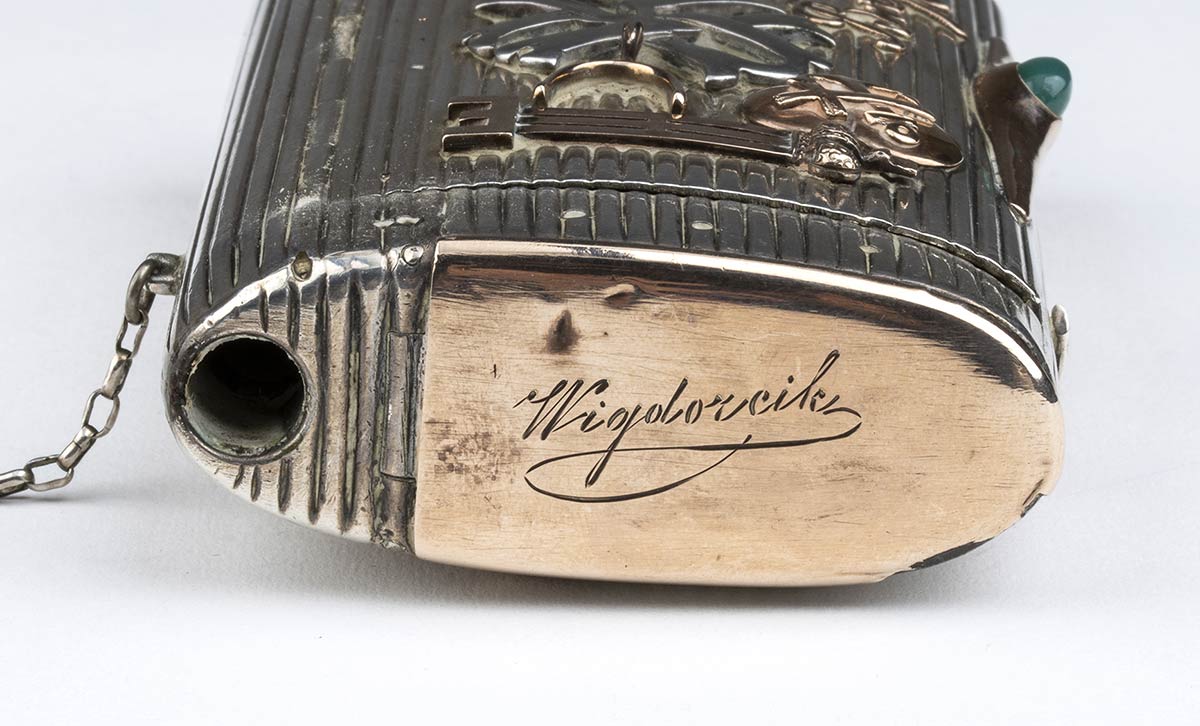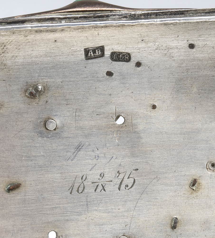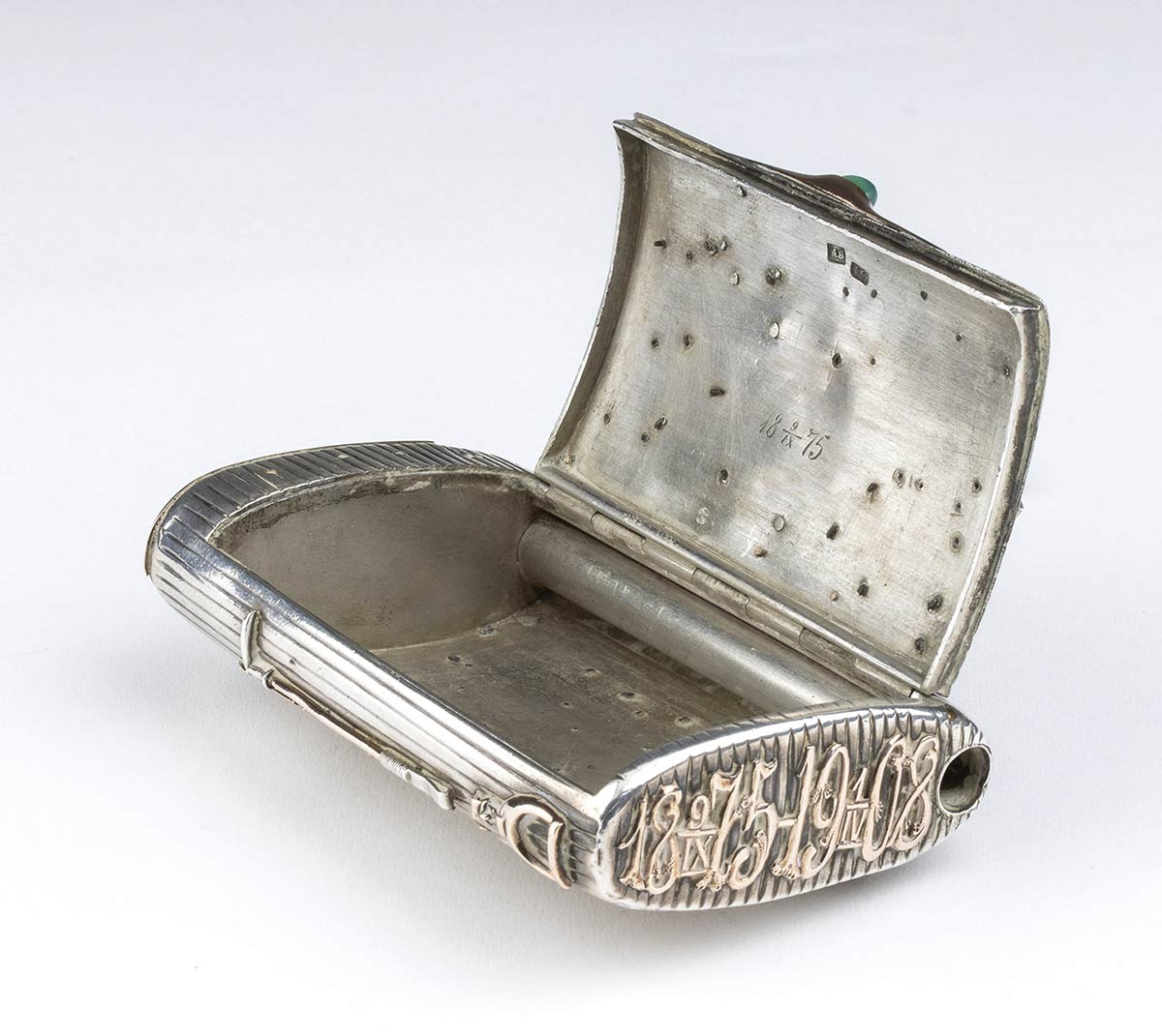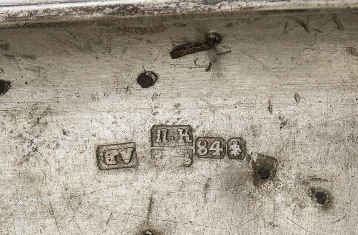 di forma rettangolare con tabacchiera laterale. Corpo scanalato decorato interamente con scritte e decorazioni ippiche. Argento 875/1000, serie completa di marchi per l'argento al titolo di 84 zolotniks in uso a San Pietroburgo nel 1875.