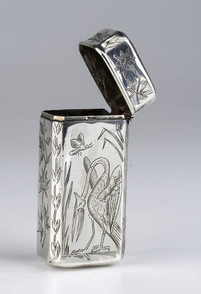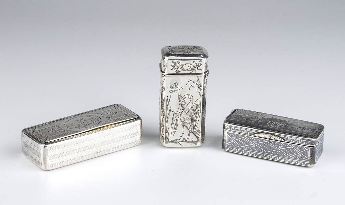 3) di forma rettangolare verticale, coperchio incernierato, incisa con motivi floreali, animali e con personaggio maschile, argento 800/1000 punzonata con marchi francesi in uso dal 1838; altezza x larghezza x profondità: 7 x 3,1 x 2 cm, peso 59 gr.