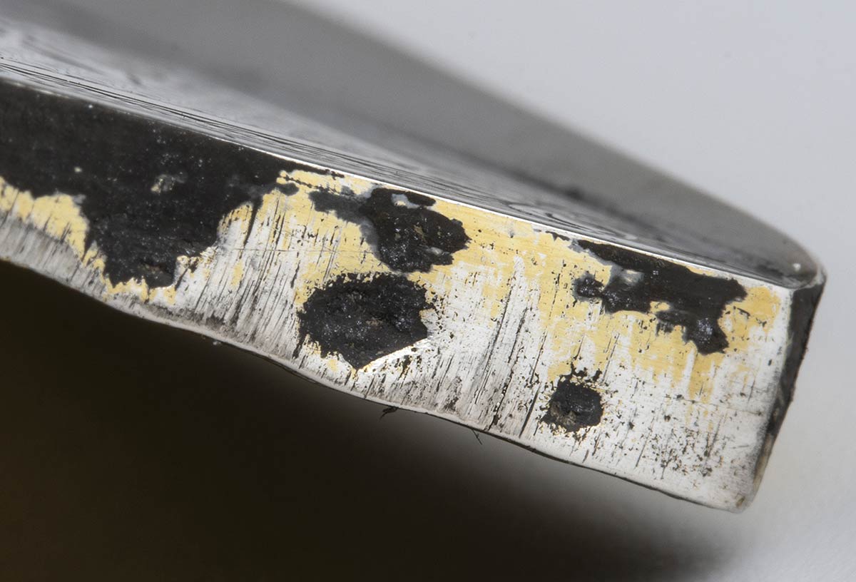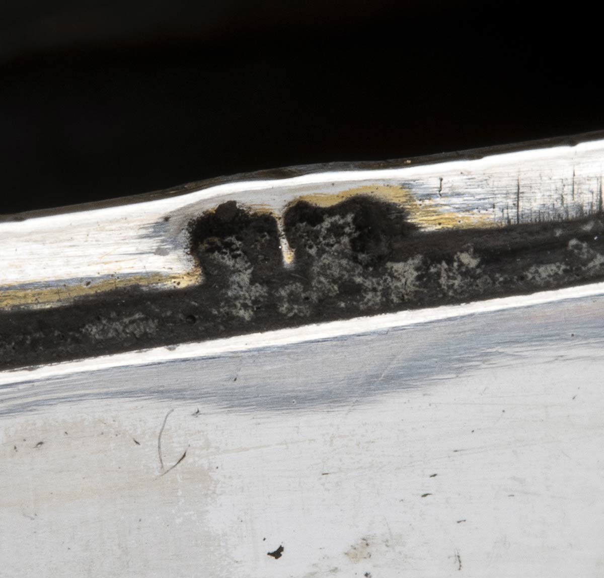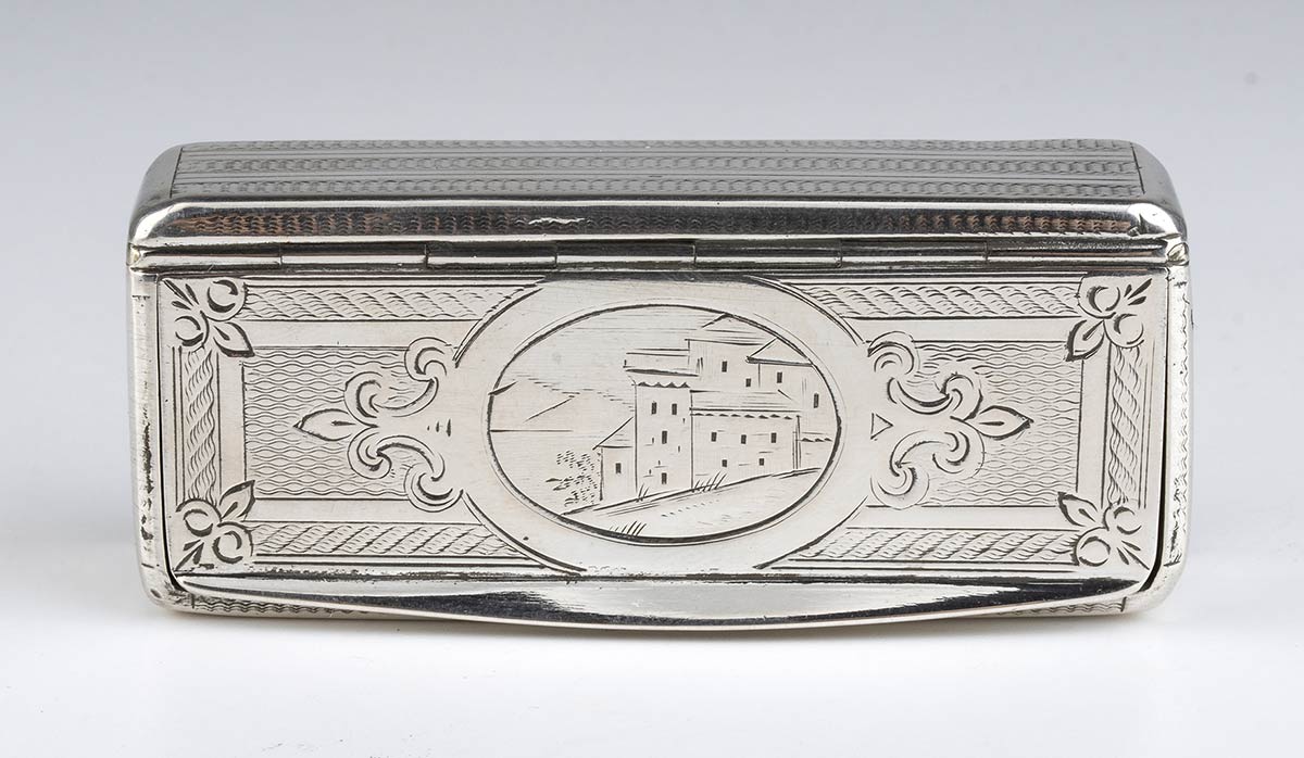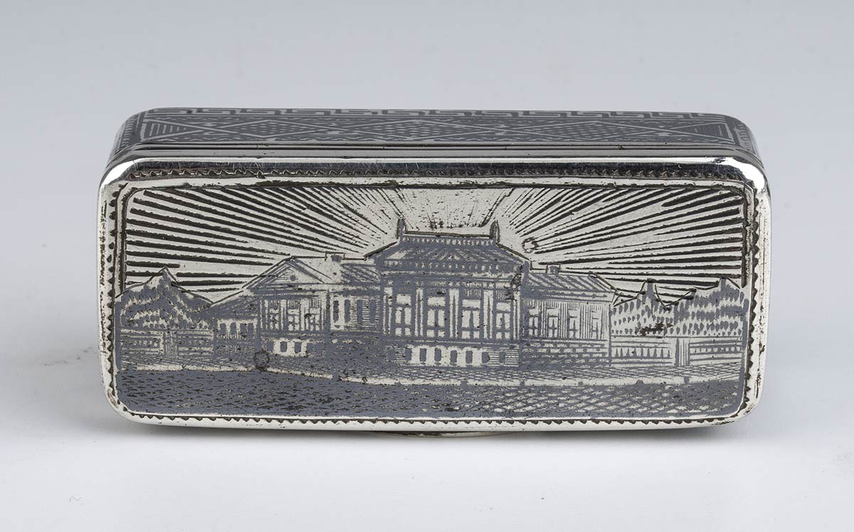 1) di forma rettangolare decorata a niello, coperchio incernierato inciso con scena cittadina, argento 875/1000, punzonato con i marchi di controllo russi in uso nel XIX secolo per l'argento al titolo di 84 zolotnik (875/1000), interno dorato; altezza x larghezza x profondità: 2,3 x 6,6 x 2,9 cm, peso 63 gr;
