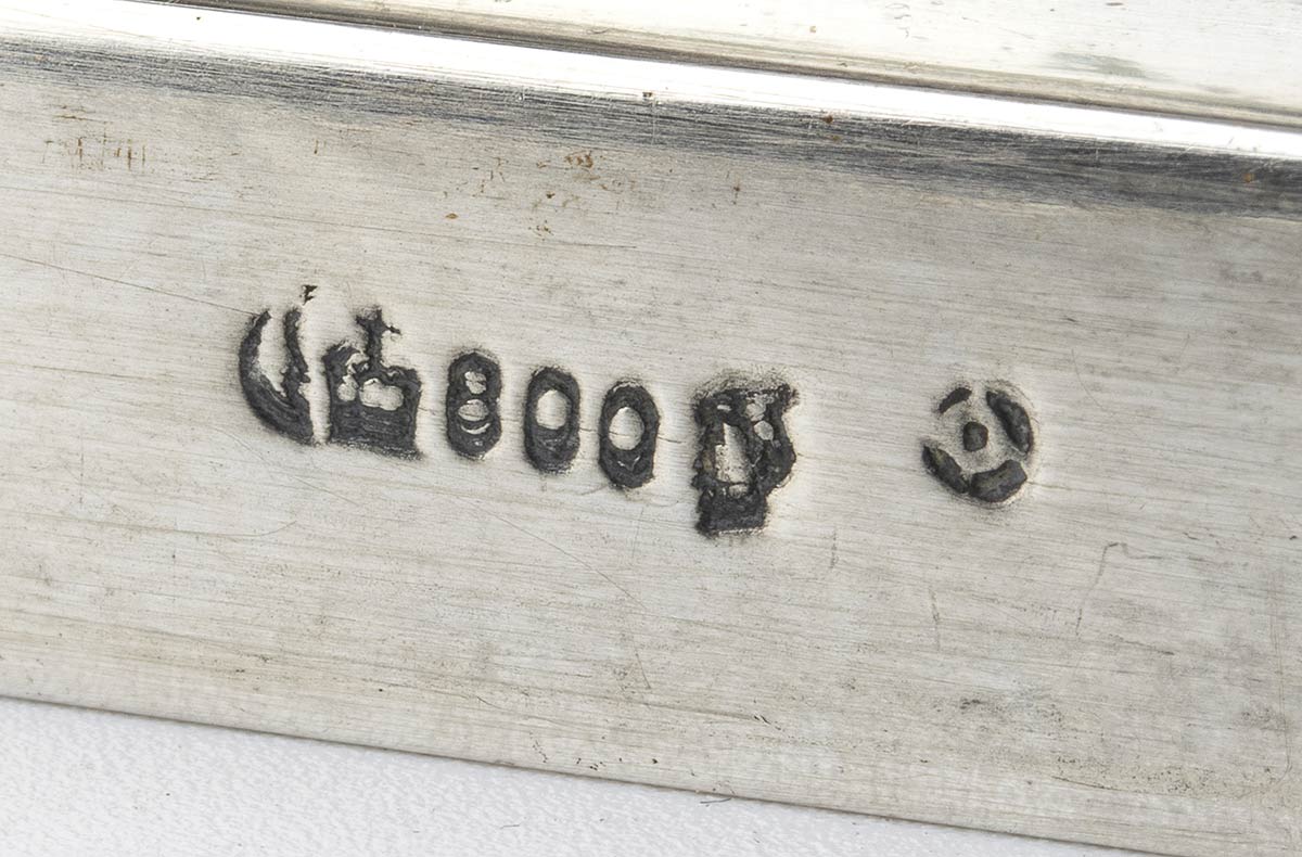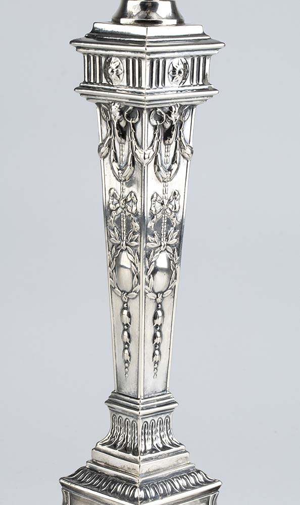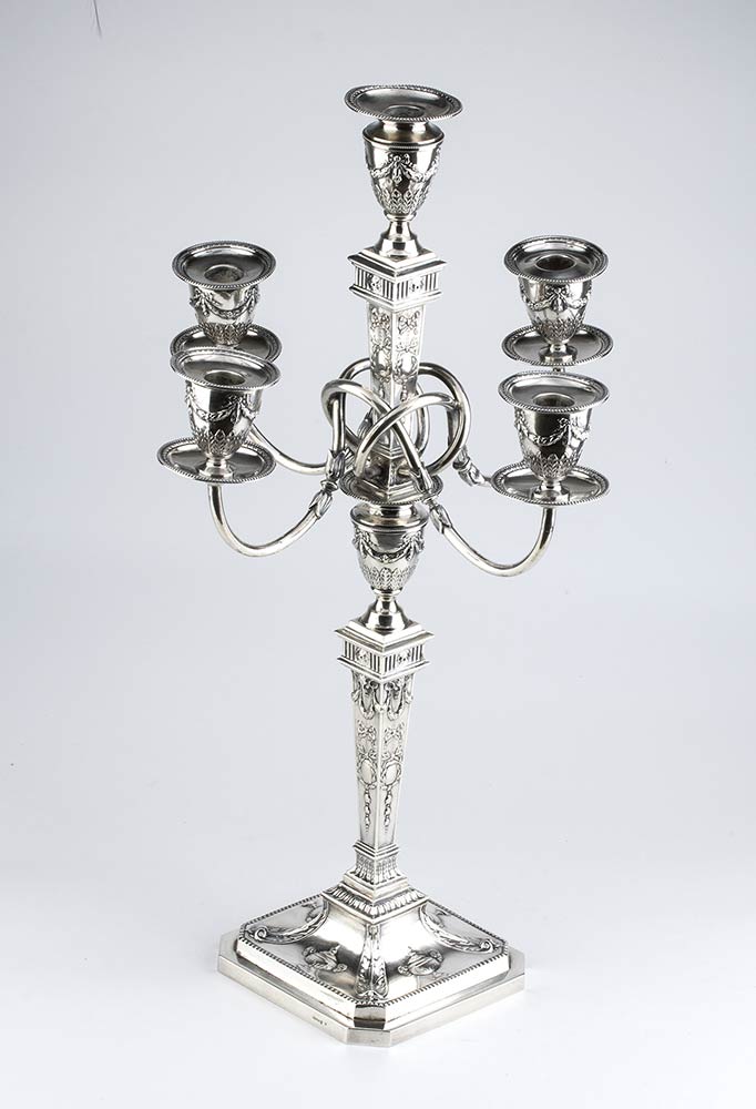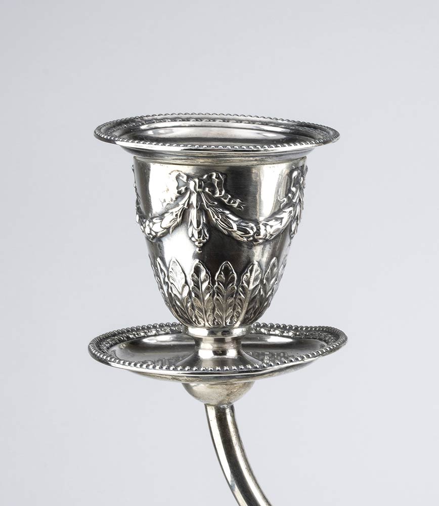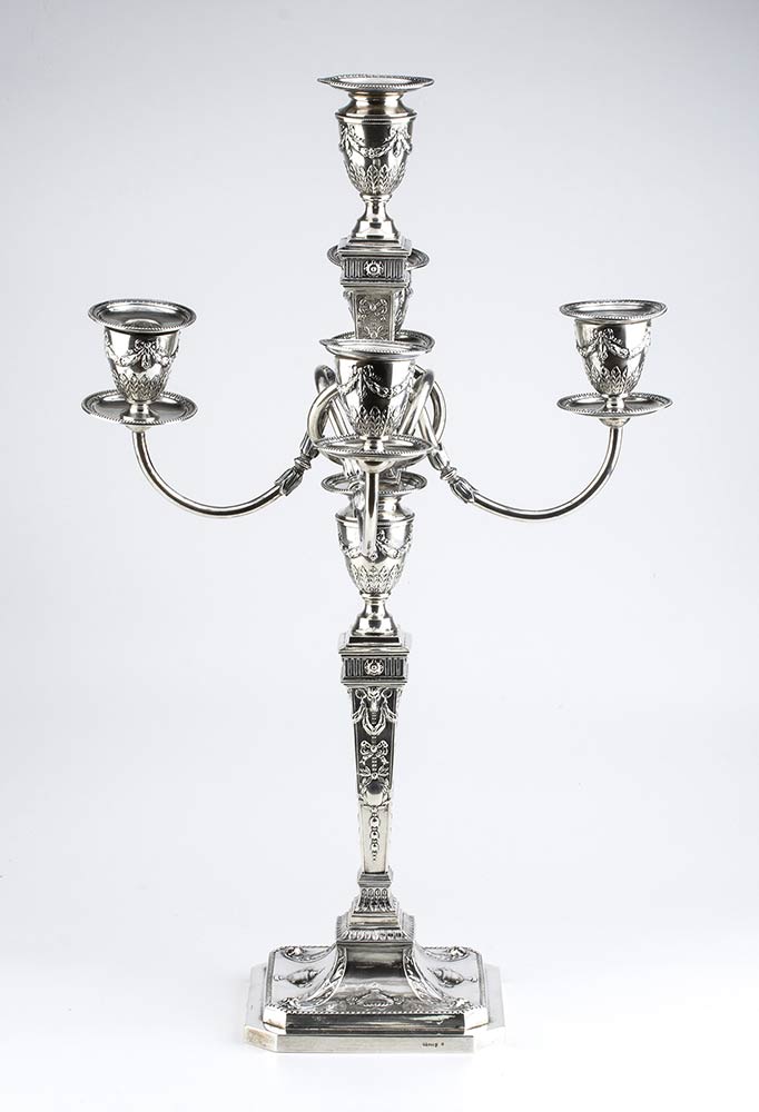 decorato in stile Adam, con base quadrata gradinata con angoli smussati e parte superiore a cinque fiamme con braccia intrecciate, piattini salva cera removibili. Argento 800/1000, punzonato con i marchi in uso in Germania dopo il 1888.