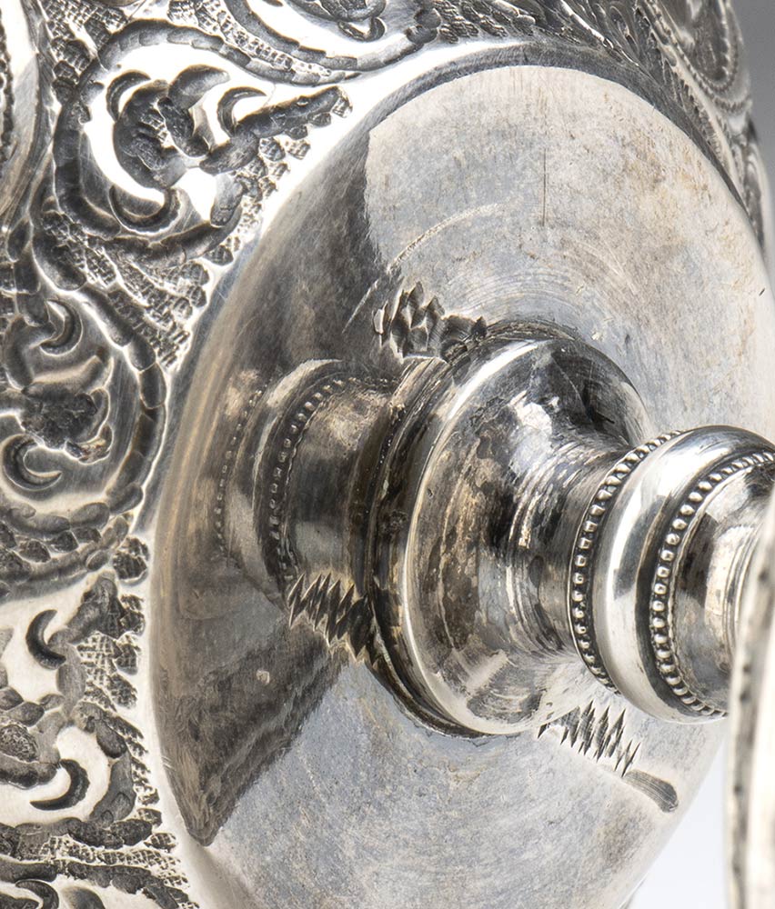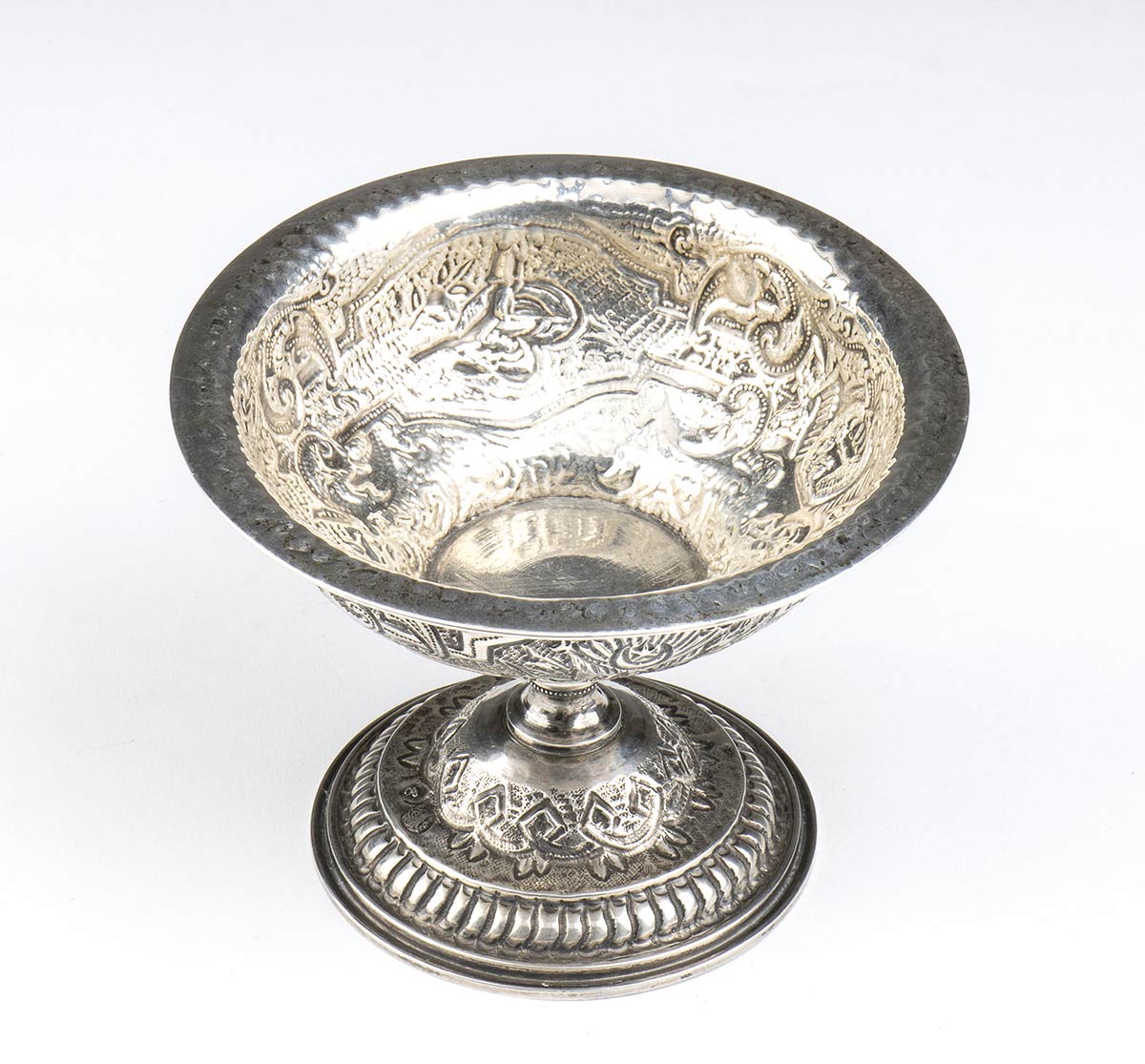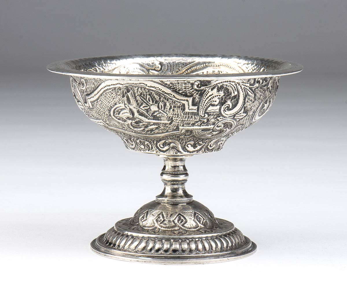 di forma circolare, sbalzata e cesellato a decori floreali. Punzonata con marchi in uso in Turchia prima del 1923.