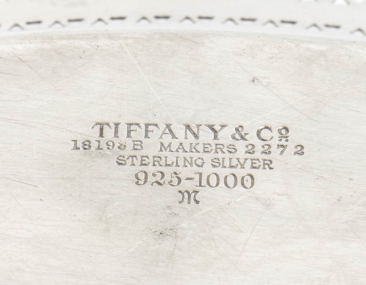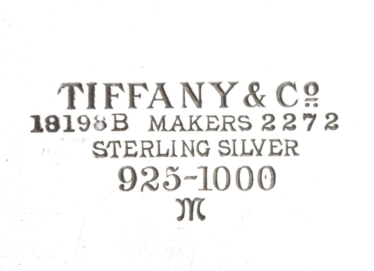 di forma ovale, la tesa traforata con decori geometrici. Argento 925/1000, punzonato Tiffany & Co, 1907-1947 (direttore John C. Moore II).