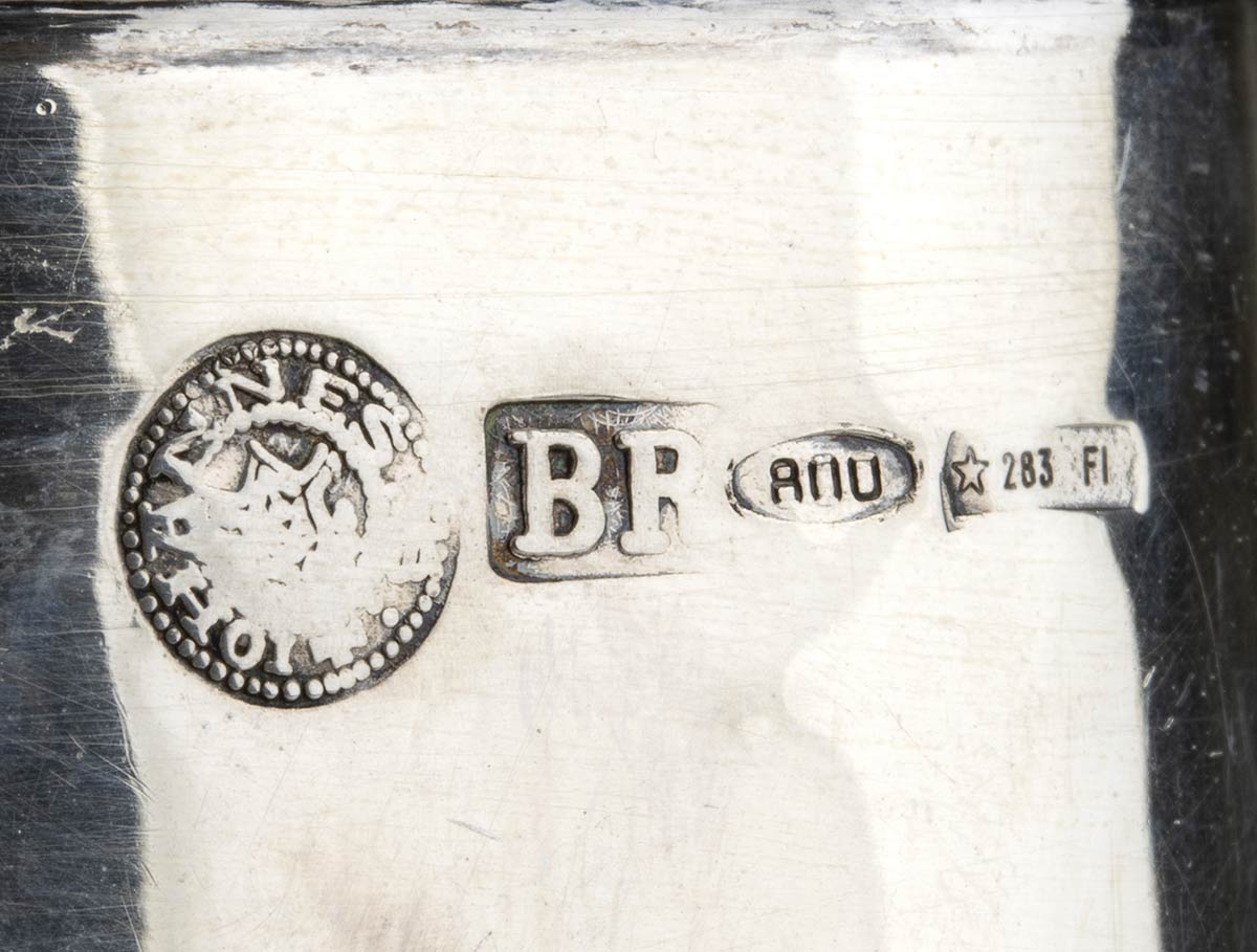 due boccali coon manico a doppia voluta e un decanter in argento 800/1000, punzonati *283 Firenze - Brandimarte - 800"