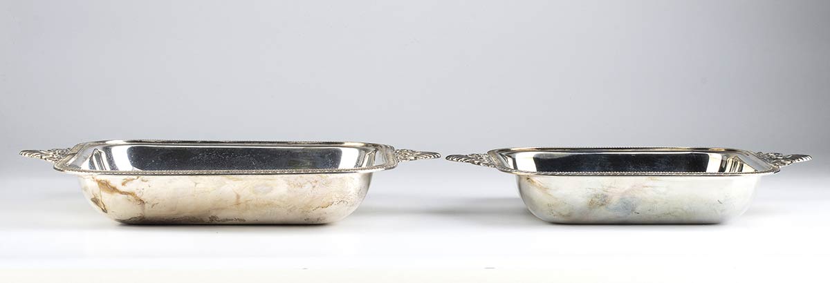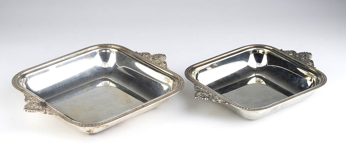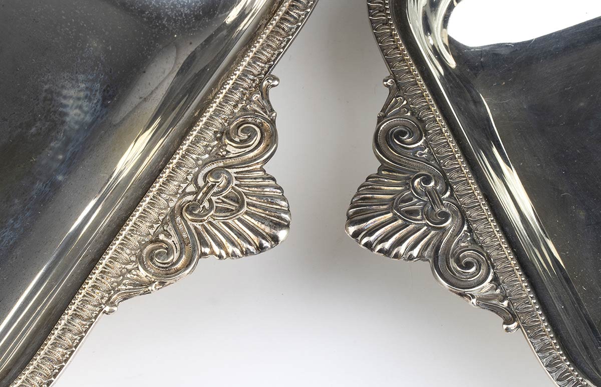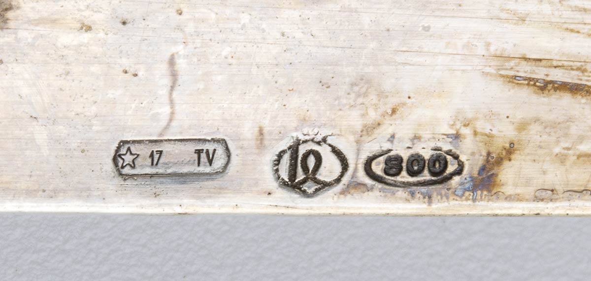 di forma quadrata con manici laterali e bordatura a palmette. Argento 800/1000, punzonata "800" e "* 17 TV", argentiere Schiavon Angelo.
