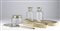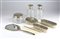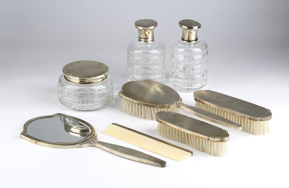 composto da tre spazzole, un pettine, uno specchio, due flaconi ed una scatola in vetro molato incisi con motivi floreali. Argento 800/1000, punzonati "800".