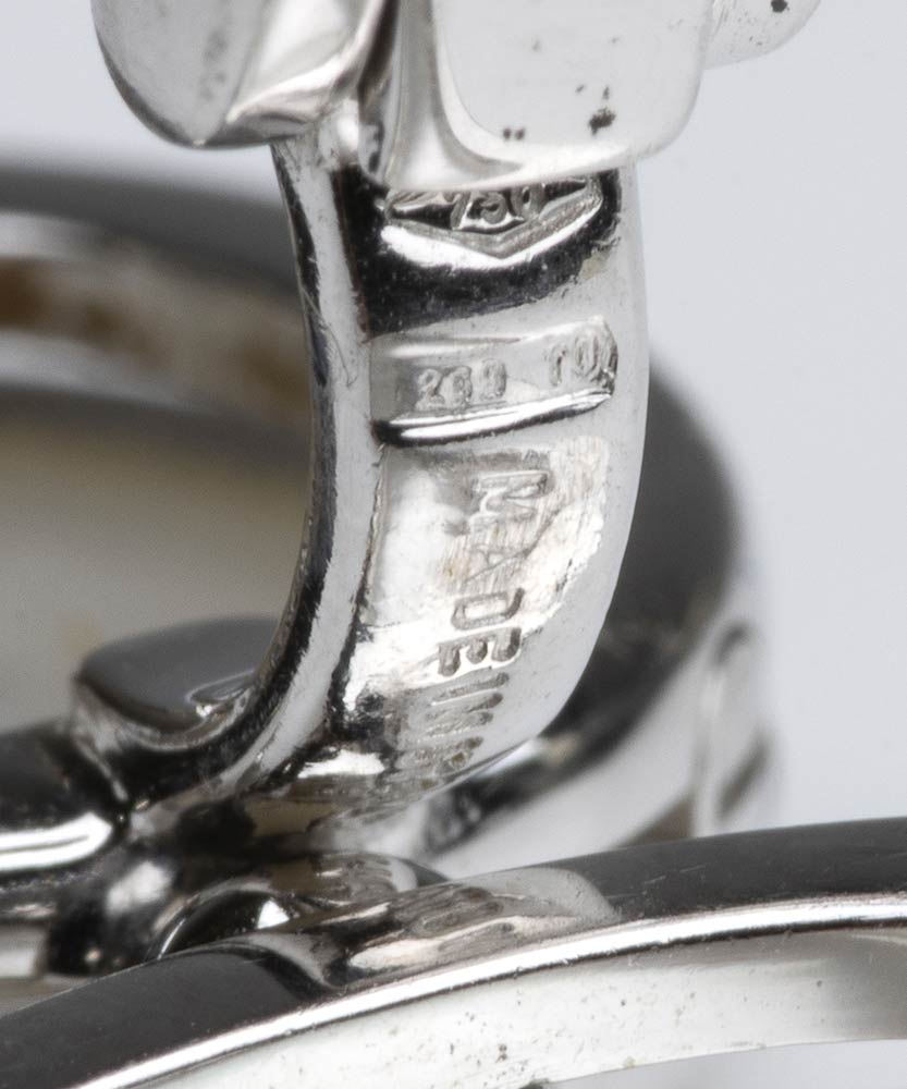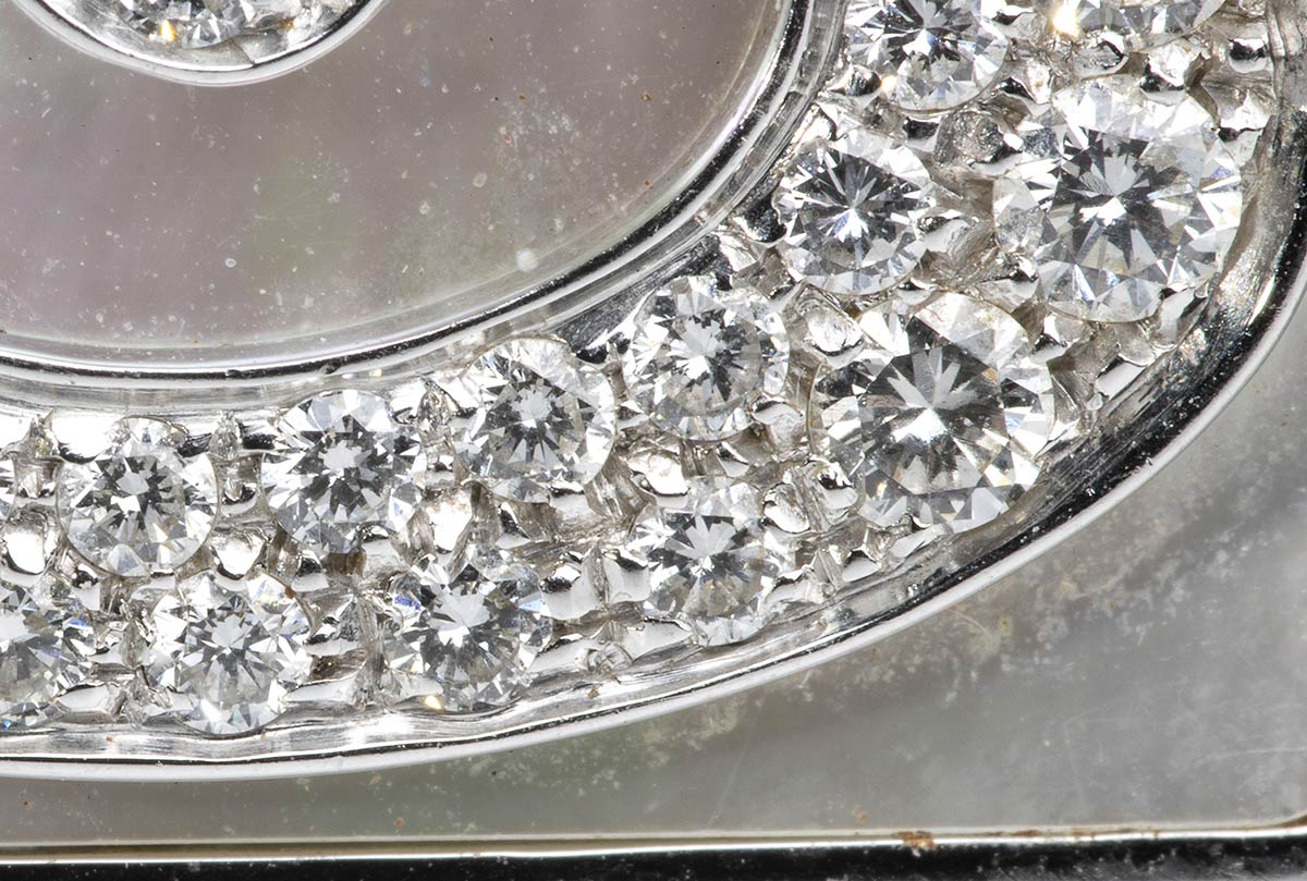 oro giallo 18k, con inserti di madreperla e motivi a nastro in diamanti.