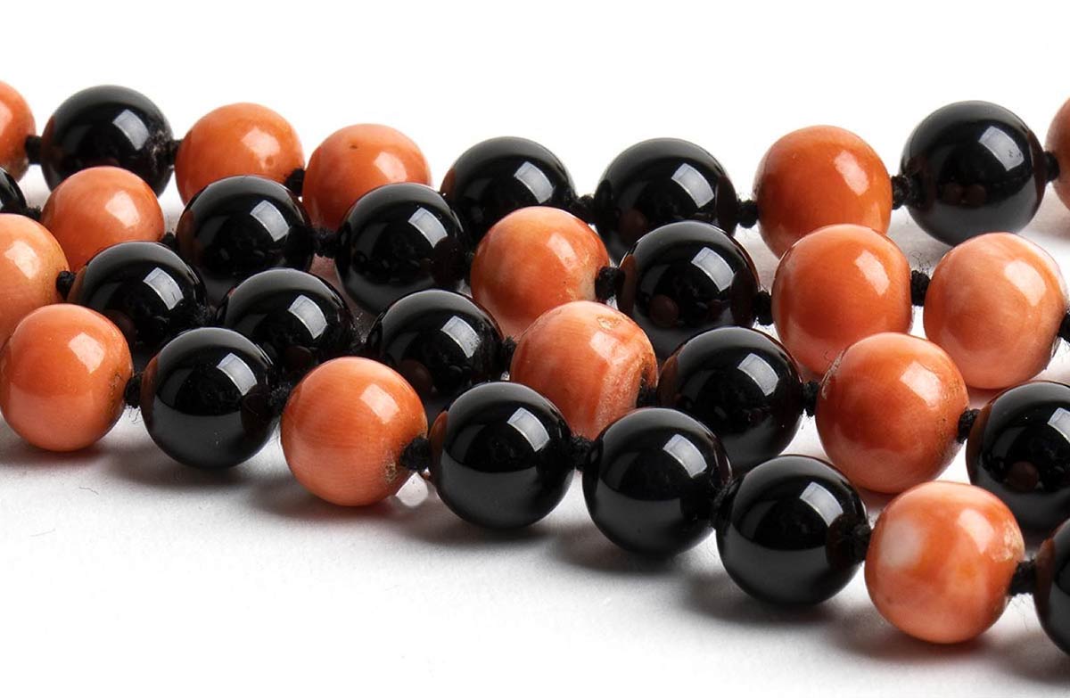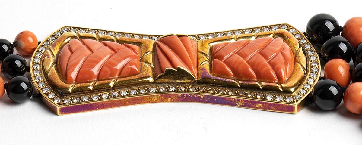 due fili di sfere di onice con sezione centrale a tre fili di sfere di corallo Cerasuolo (coralium elatius) alternate ad onice, con elemento a motivo di fiocco in oro giallo 18k incastonato con inserti di corallo inciso incorniciati da diamanti rotondi taglio brillante 2,15 ct circa, G-H, VVS-VS .
