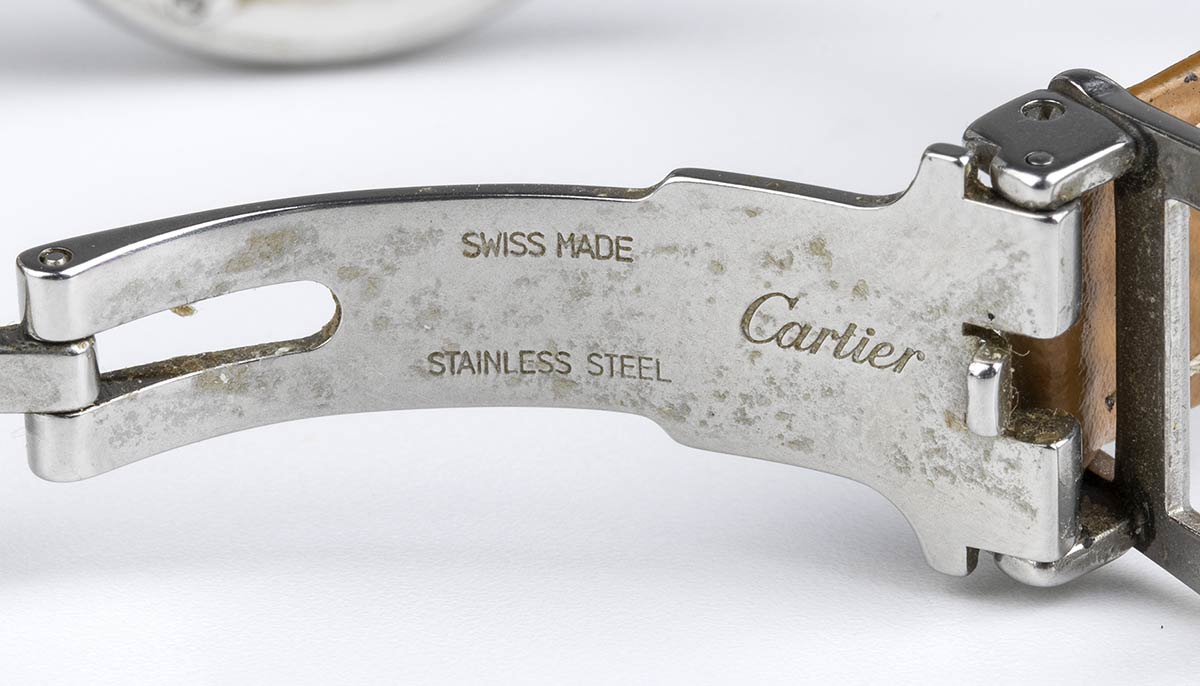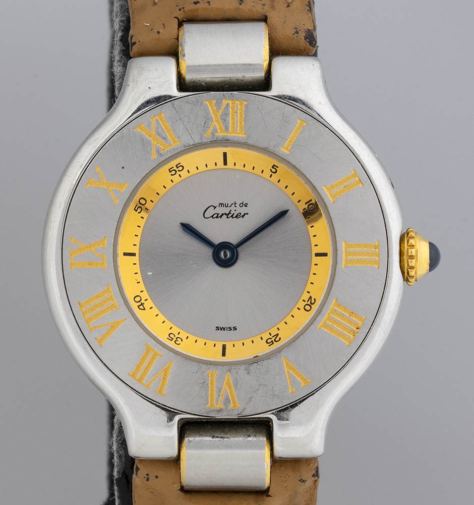 cassa e bracciale in acciaio, quadrante argenté e numeri romani incisi sulla ghiera, corona di carica con zaffiro cabochon, firmato Must de Cartier. Cinturino in pelle chiara. Movimento al quarzo. Punzonato sul bracciale: " Cartier " e sul fondello "Must de Cartier 21 - swiss made - water resistant - 1340 - pl210741".