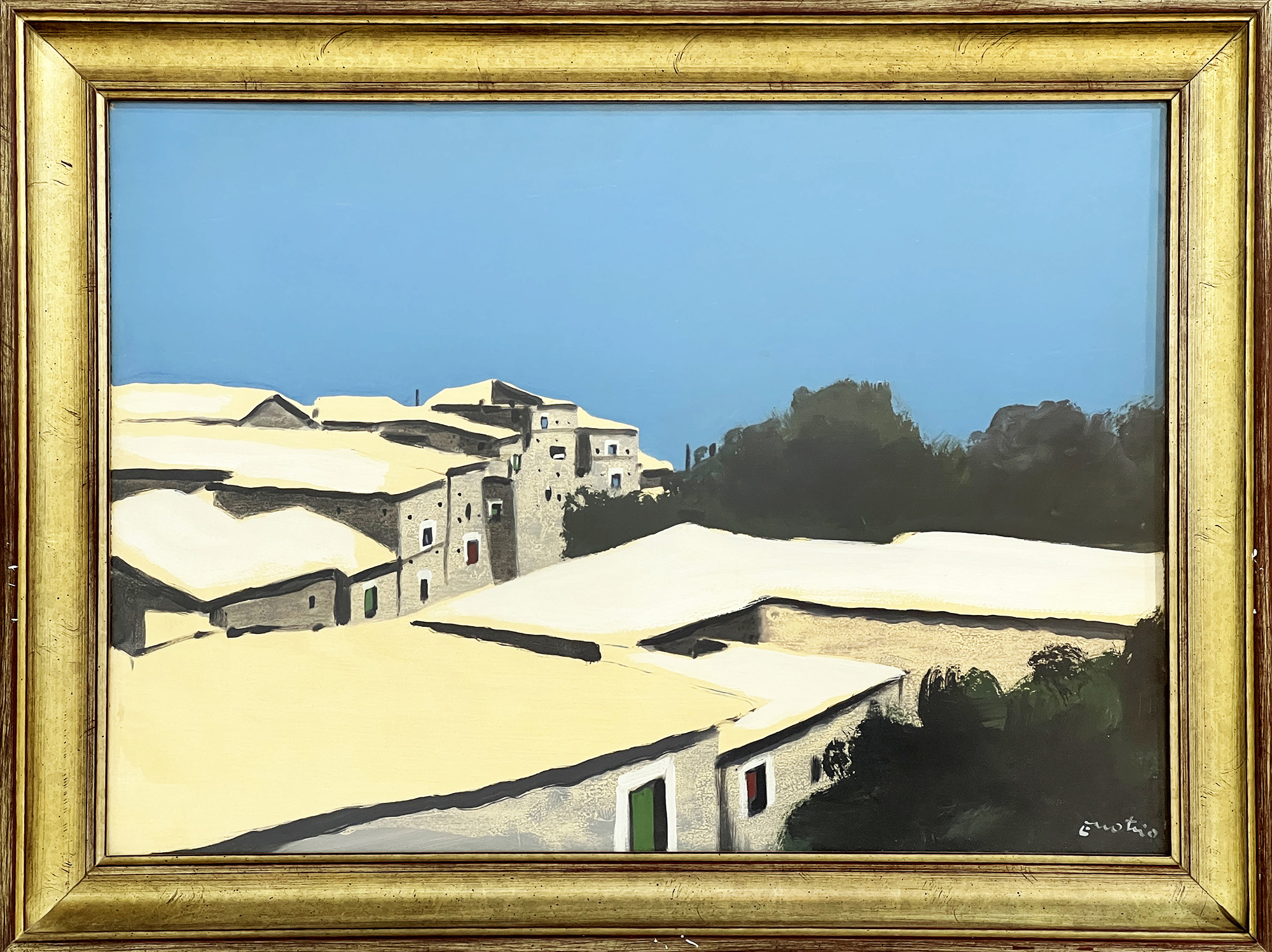 Enotrio Pugliese Tetti e neve, 1982 olio su tavola cm 70x50 Autentica a cura...