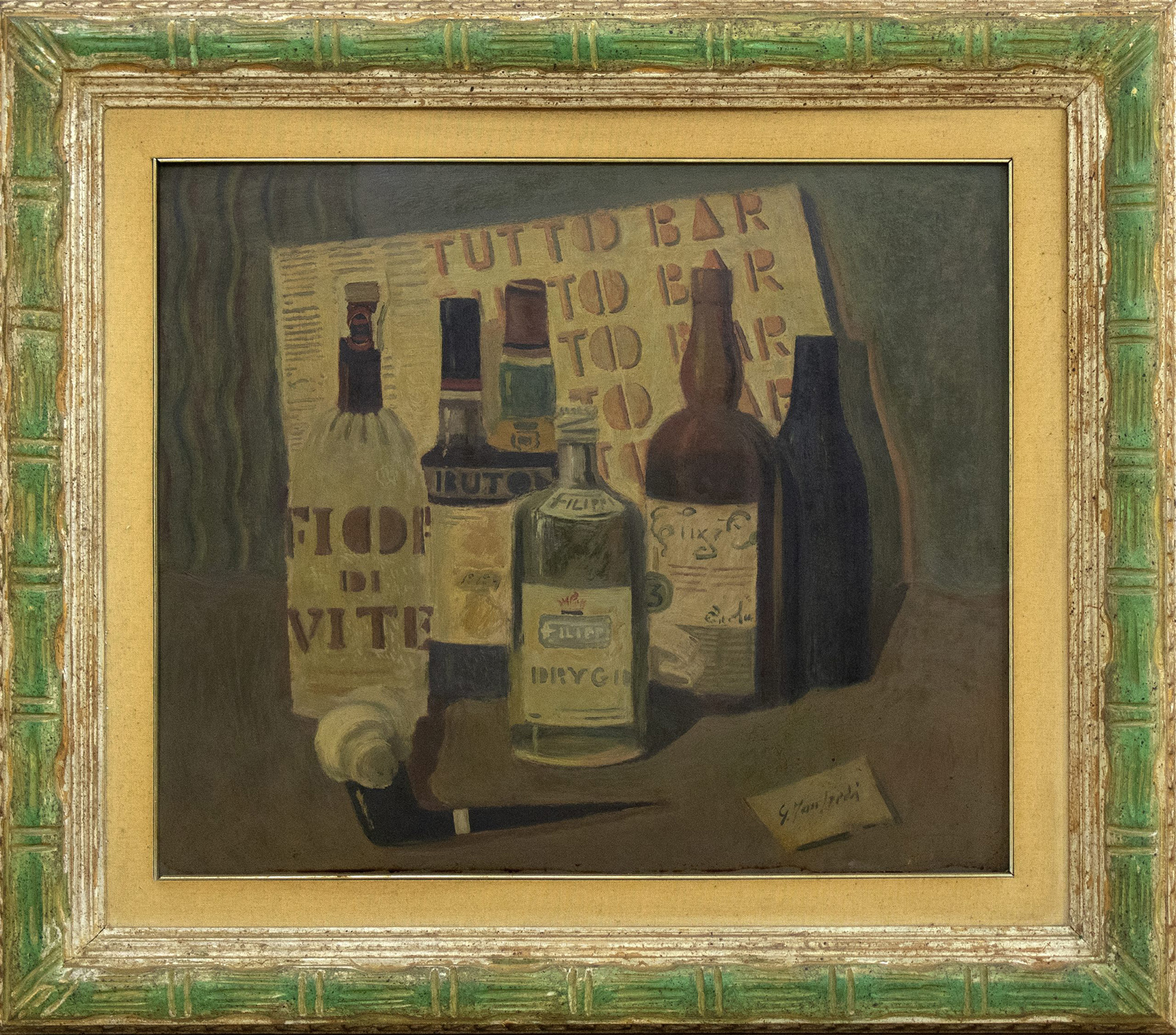 Giuseppe Manfredi Natura morta di bottiglie, Anni Ottanta olio su cartone cm...