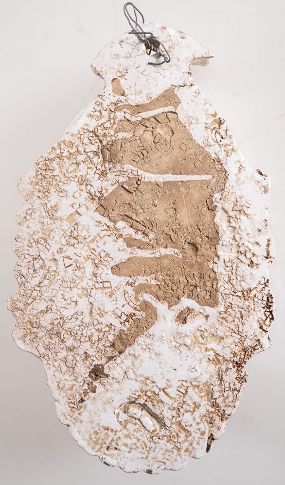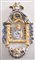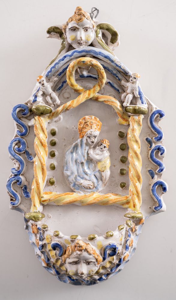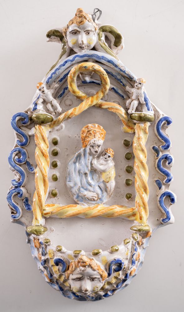 Acquasantiera in terracotta policroma. Caltagirone, XVIII secolo. Cm 33x20x8.
