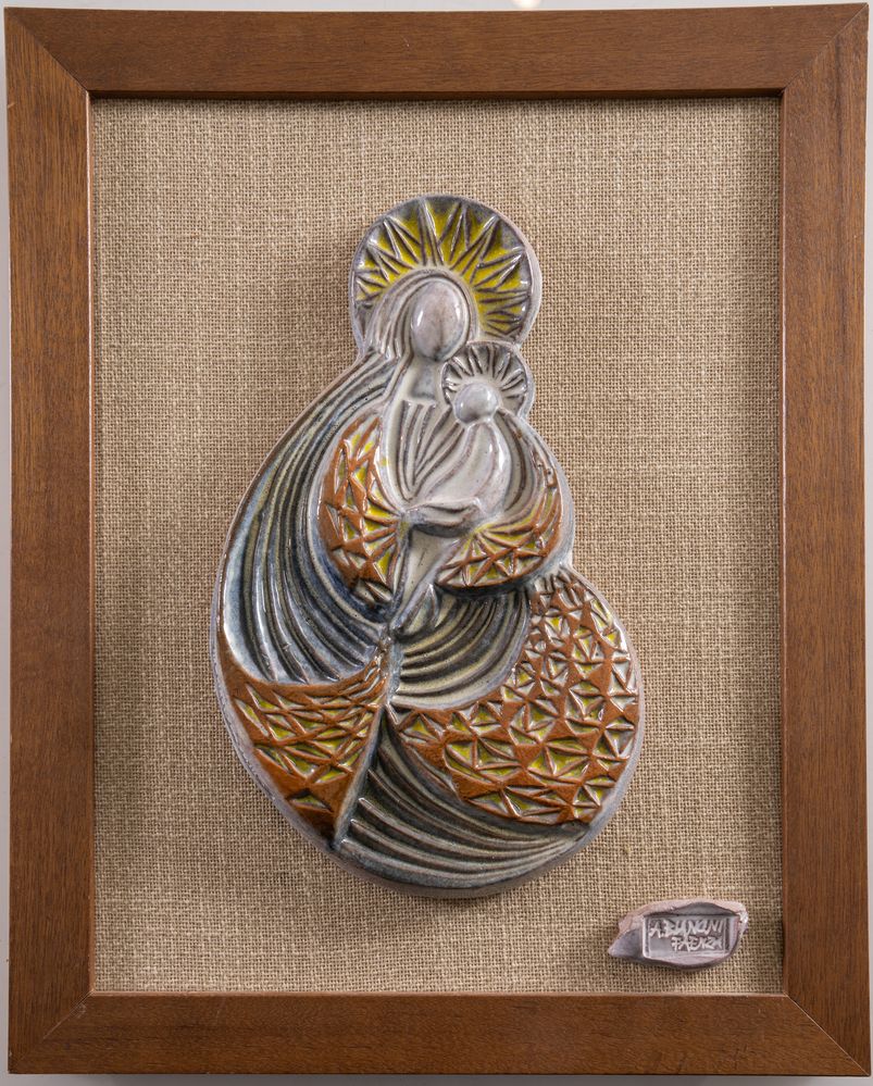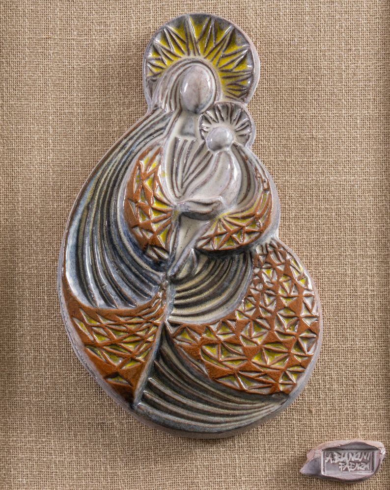 ANGELO BIANCINI (Castelbolognese 1911 - 1988) "Madonna dell'ospitalità". Bassorilievo in ceramica. Seconda metà del XX secolo. Opera firmata ad incisione in basso a destra A. Biancini Faenza. Cm 33x20x2,5.