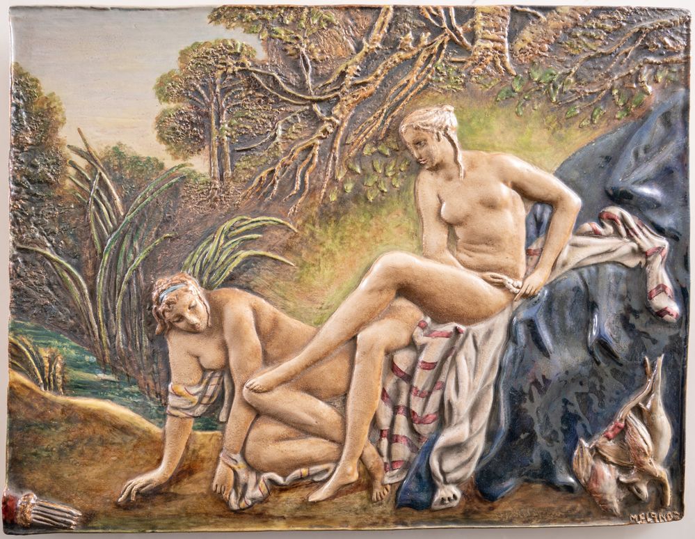 PIETRO MELANDRI (Faenza 1885 - 1976) Pannello in ceramica policroma raffigurante Diana al bagno, smaltato e riflessato in blu. 1960 ca. Opera firmata a rilievo in basso a destra Melandri. Cm 30x38,5x2.