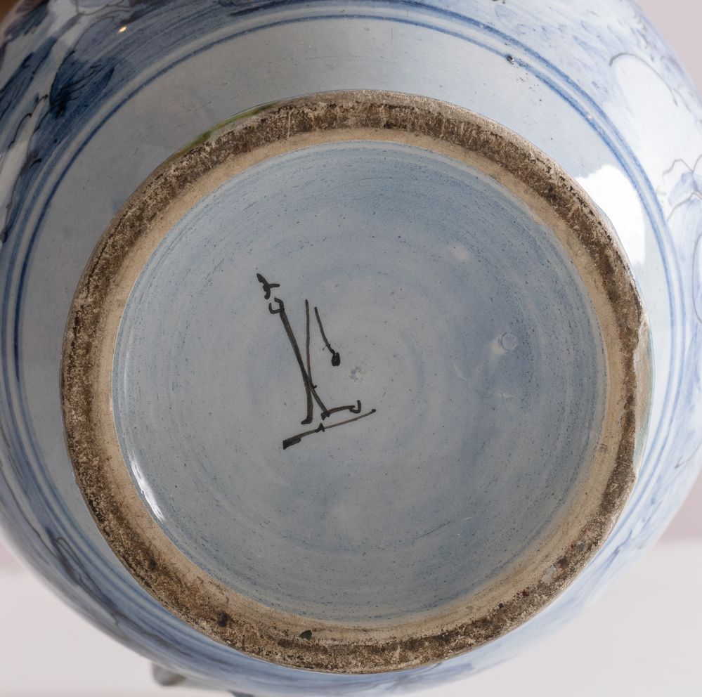 MANIFATTURA ALBA DOCILIA, Albisola, inizi del XX secolo. Versatoio in maiolica policroma decorato con putti e paesaggio con costruzioni. Al retro reca marchio. Cm 20x21x14. (piccolo restauro sul piede)