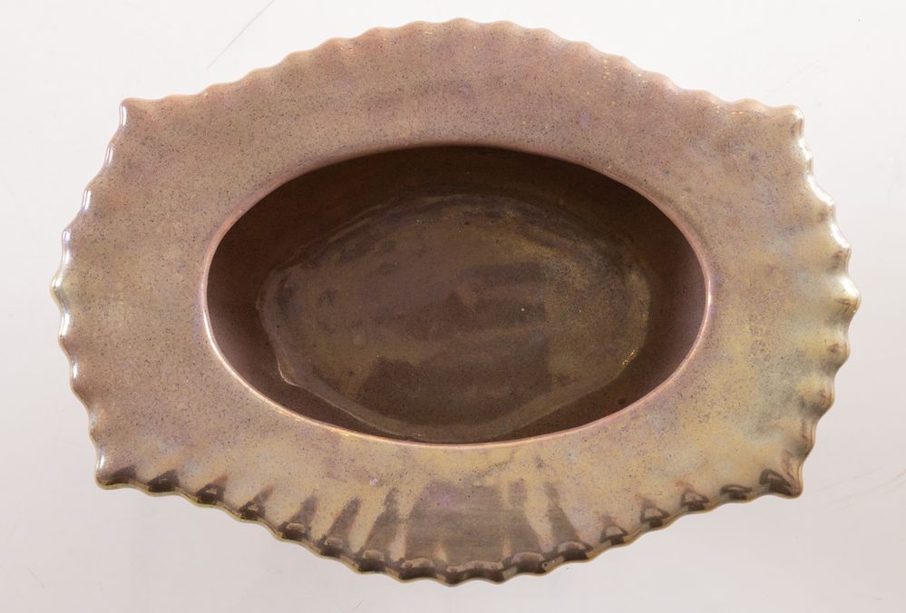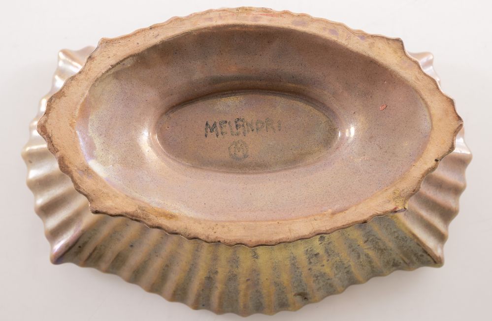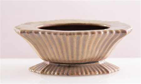 PIETRO MELANDRI (Faenza 1885 - 1976) Giardiniera in ceramica smaltata sui toni del rosa e riflessata in verde. 1950. Opera firmata alla base Melandri, M entro cerchio. Cm 9x19x16.