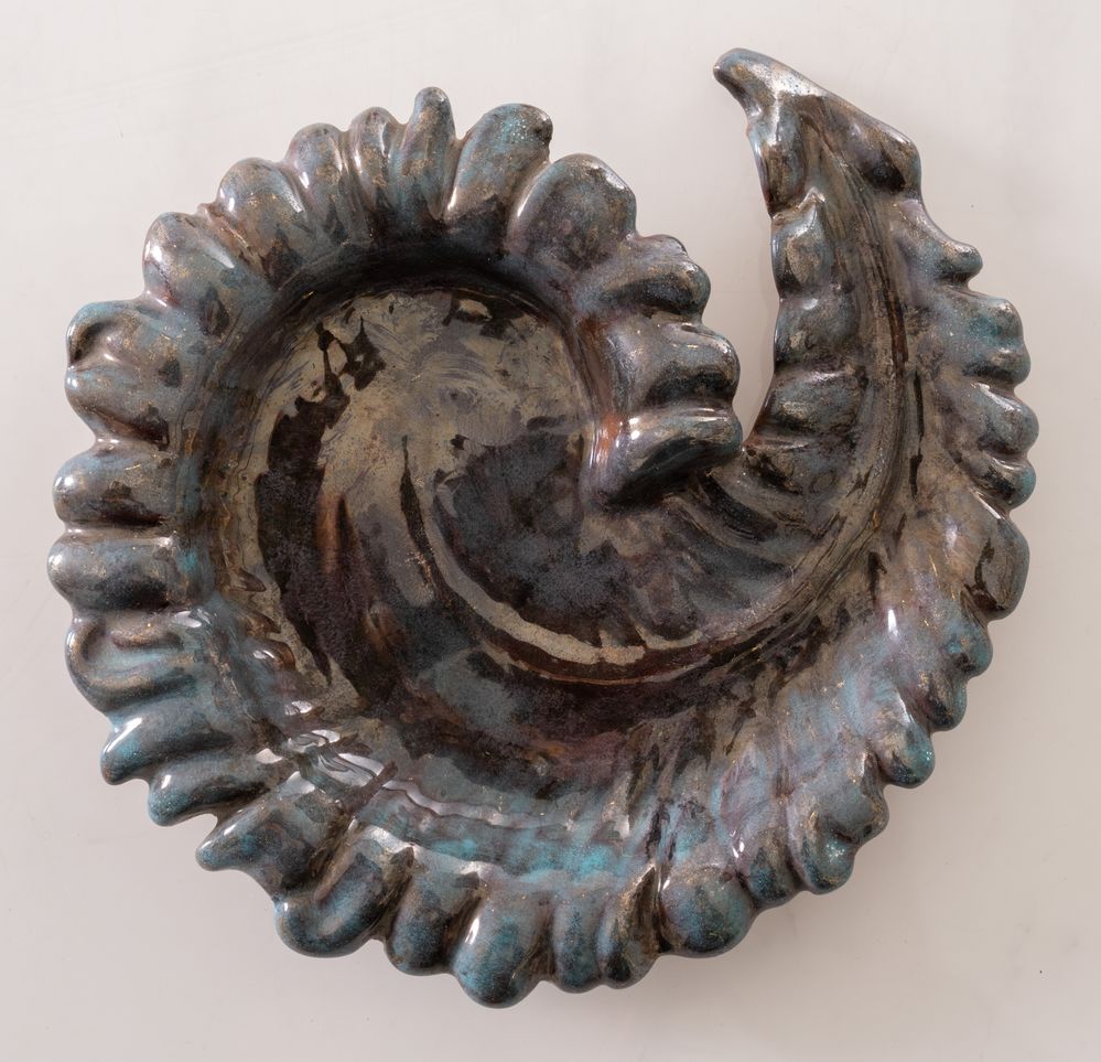 PIETRO MELANDRI (Faenza 1885 - 1976) Svuotatasche in ceramica a forma di foglia smaltato sui toni del blu. 1950 - 1960. Opera firmata sotto la base P. Melandri. Cm14x12.