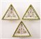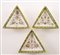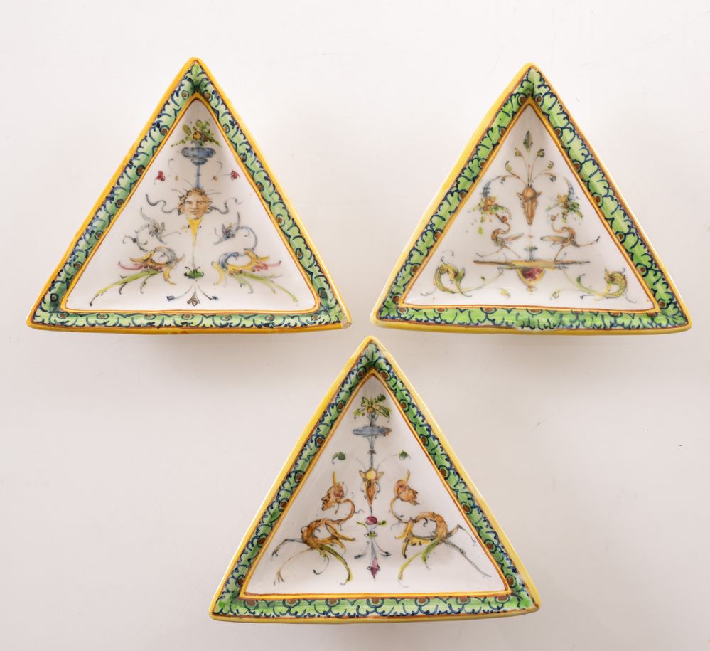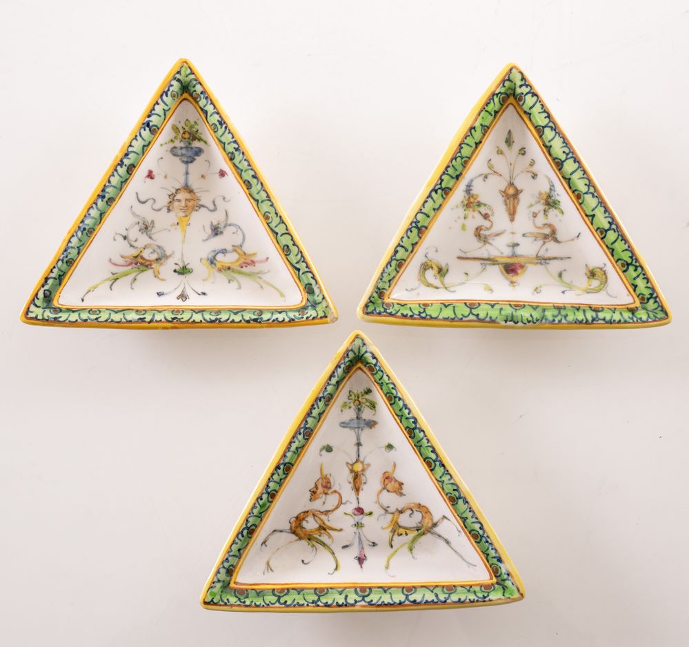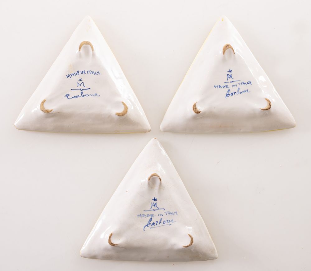 MANIFATTURA ANGELO MINGHETTI, Bologna, 1920 - 1930. Lotto composto da tre svuotatasche triangolari in maiolica policroma decorati a grottesche. Opere firmate sotto la base AM, Made in Italy, Carbone. Cadauno di cm 13x14,5x2. (lievi difetti)
