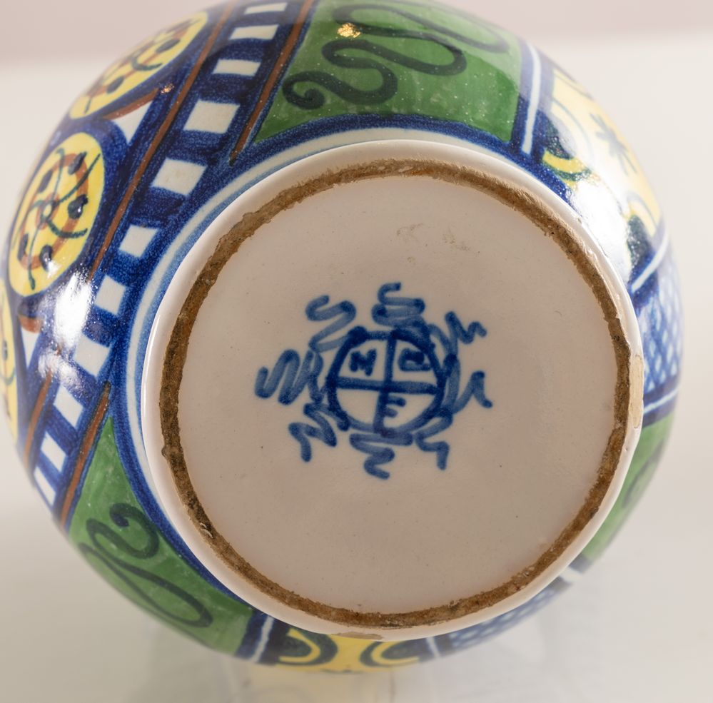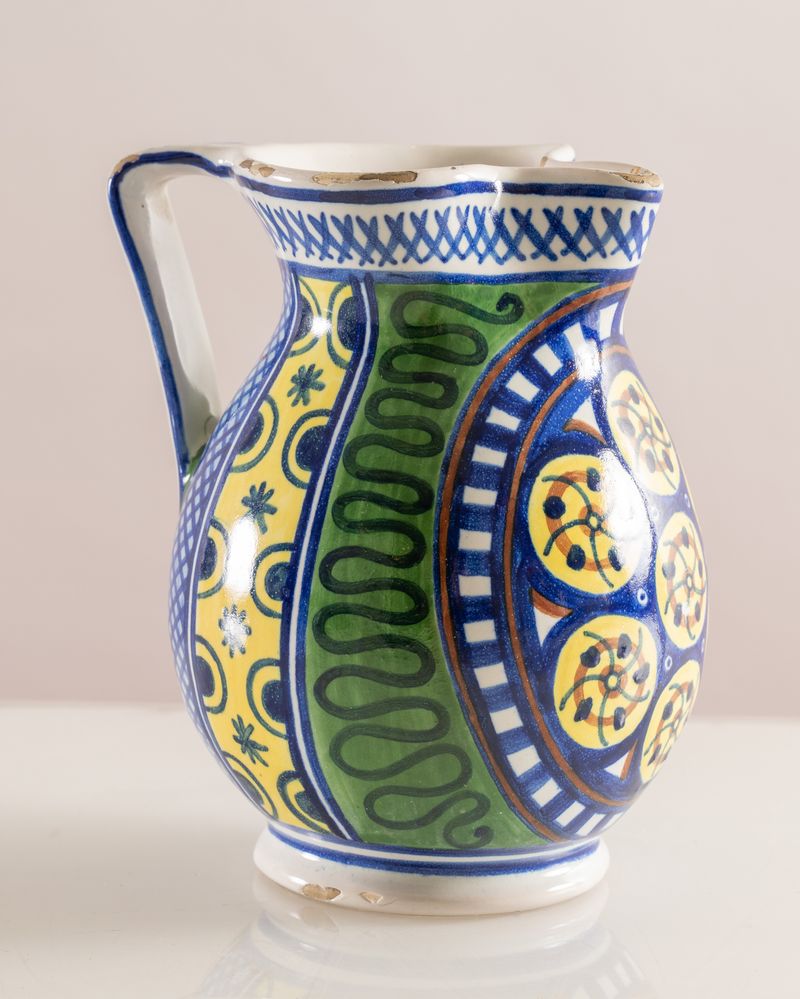 FABBRICHE RIUNITE DI CERAMICHE (Faenza 1898 - 1944) Piccolo versatoio in ceramica policroma smaltata con decorazioni geometriche. Sotto la base reca marchio. Cm 15,5x13x11,5.
