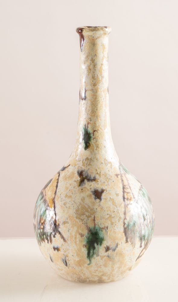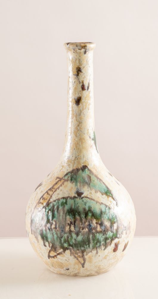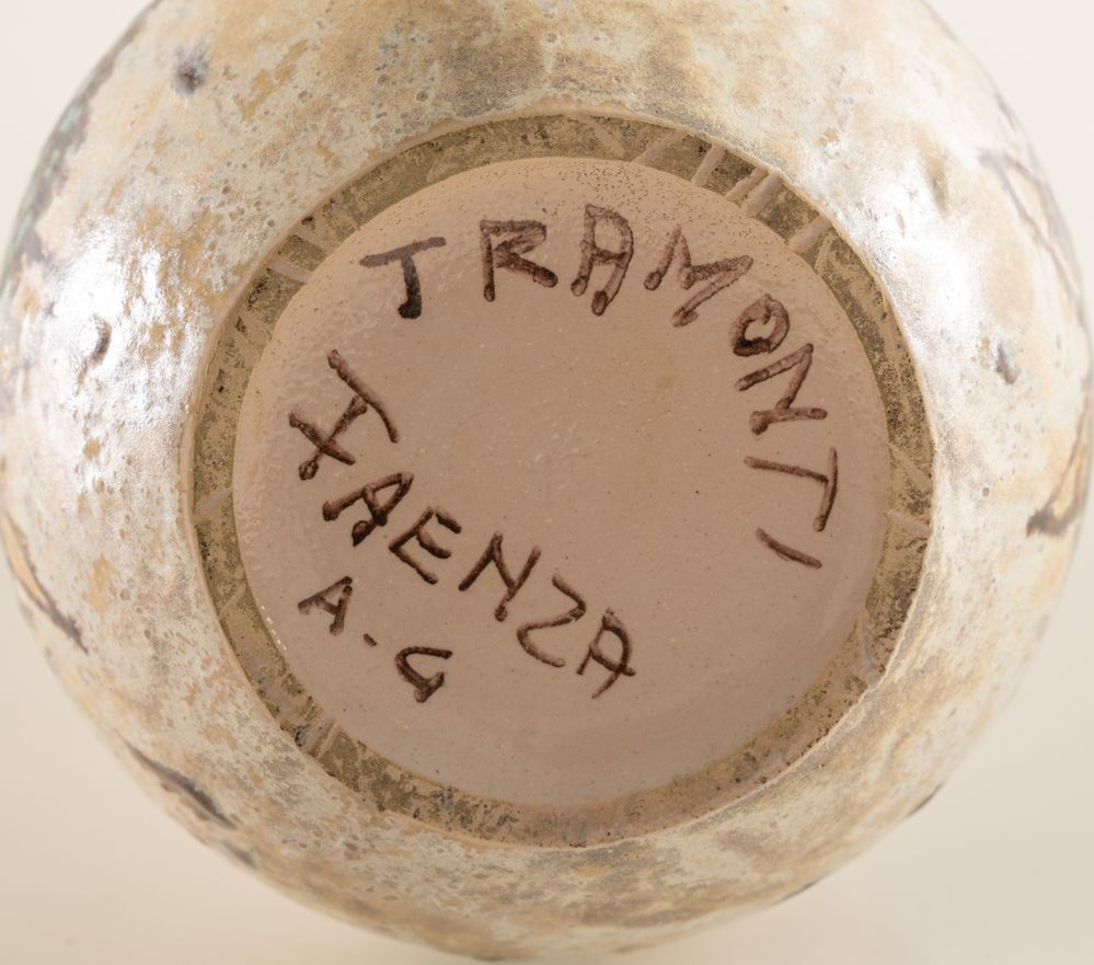 GUERRINO TRAMONTI (Faenza 1915 - 1992) Vaso in ceramica smaltata policroma. Opera firmata sotto la base Tramonti, Faenza. Cm 26x13x13.