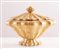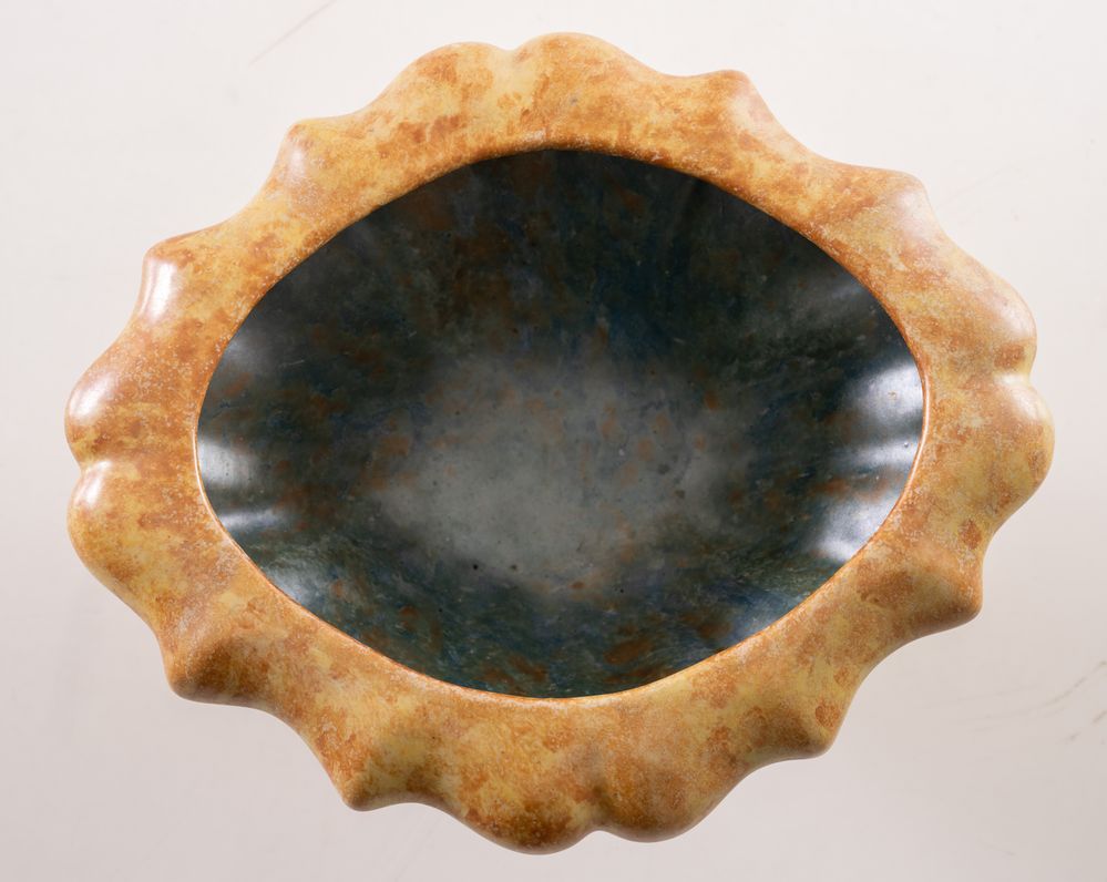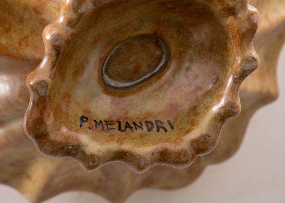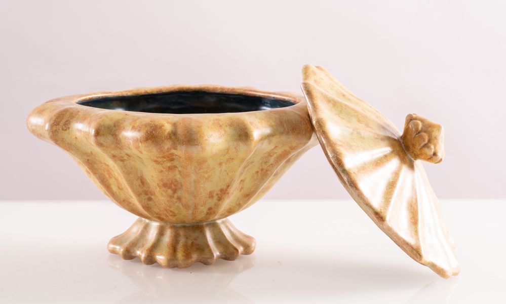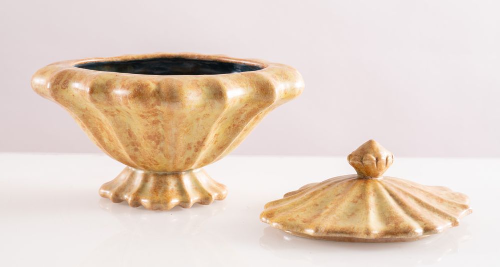 PIETRO MELANDRI (Faenza 1885 - 1976) Bomboniera in ceramica smaltata sui toni dell'ocra. 1950 - 1960. Opera firmata sotto la base P. Melandri. Cm 17x23x18.