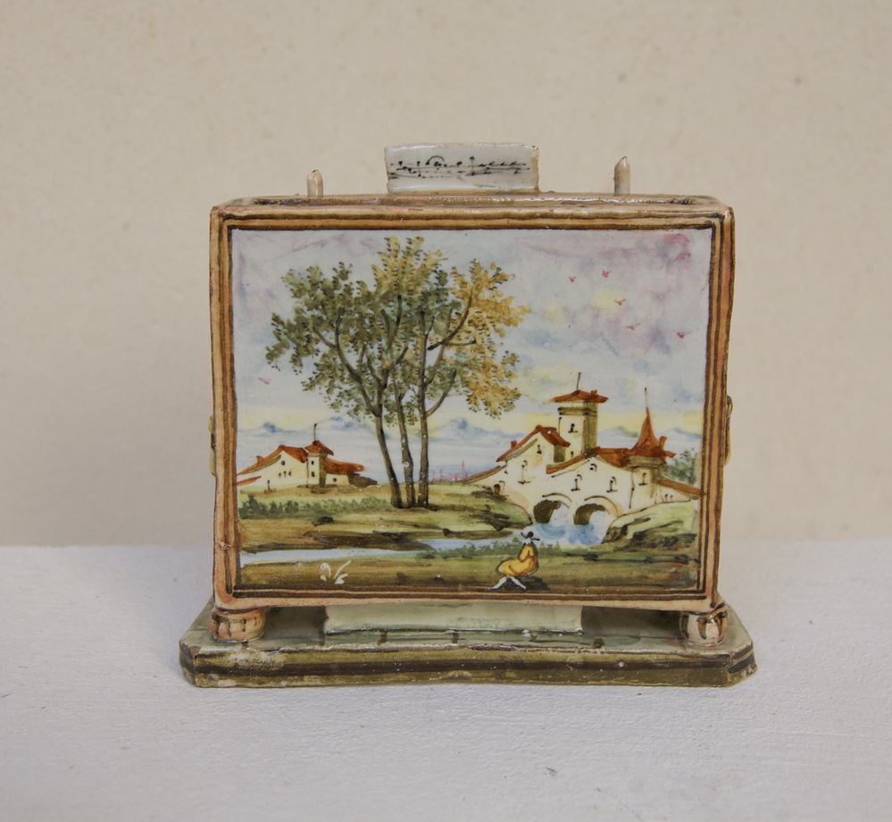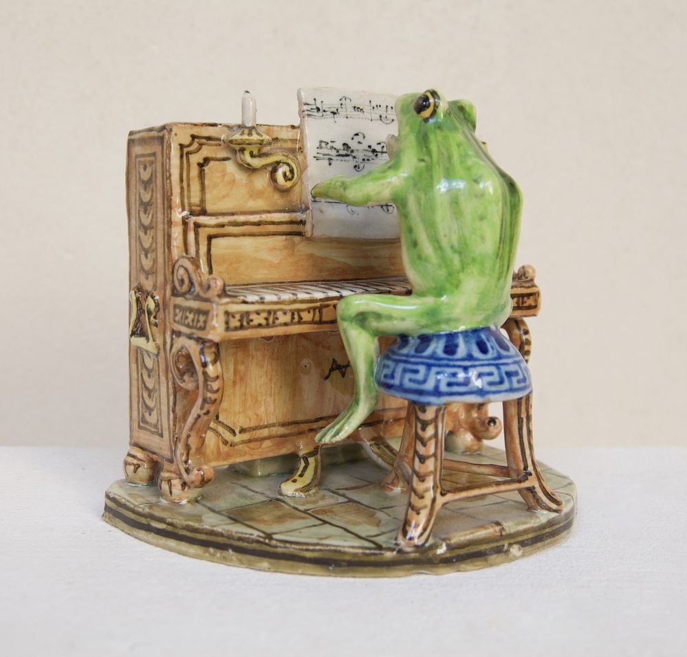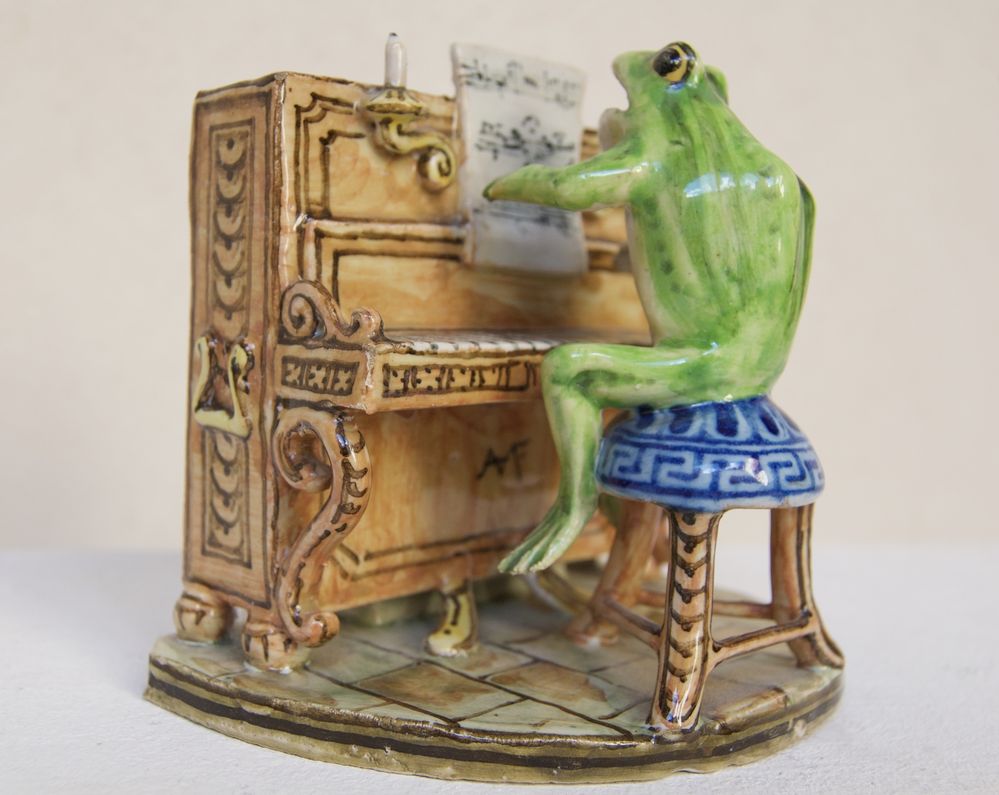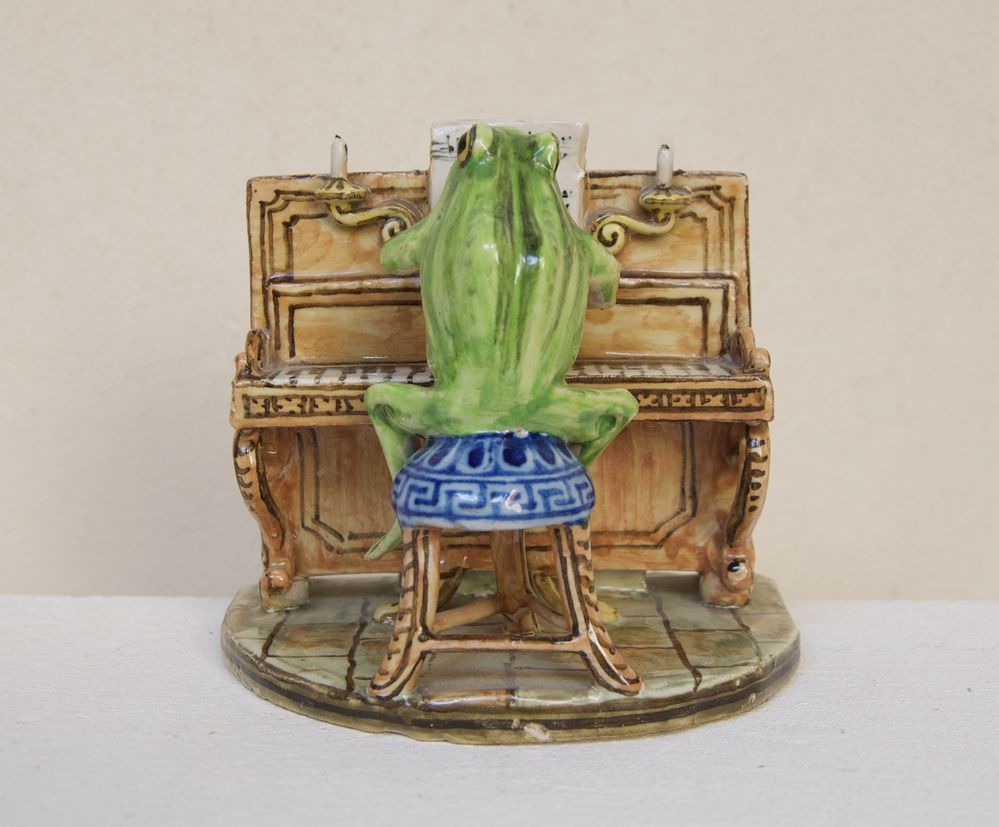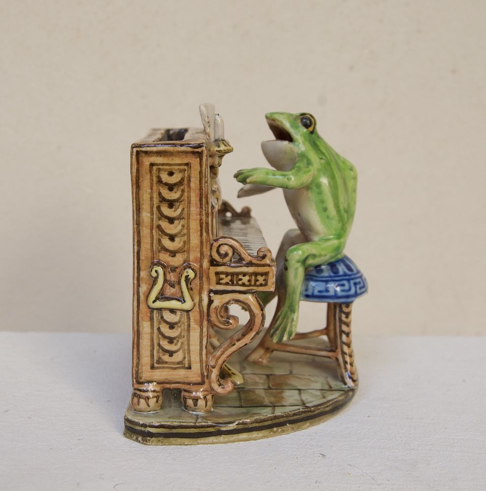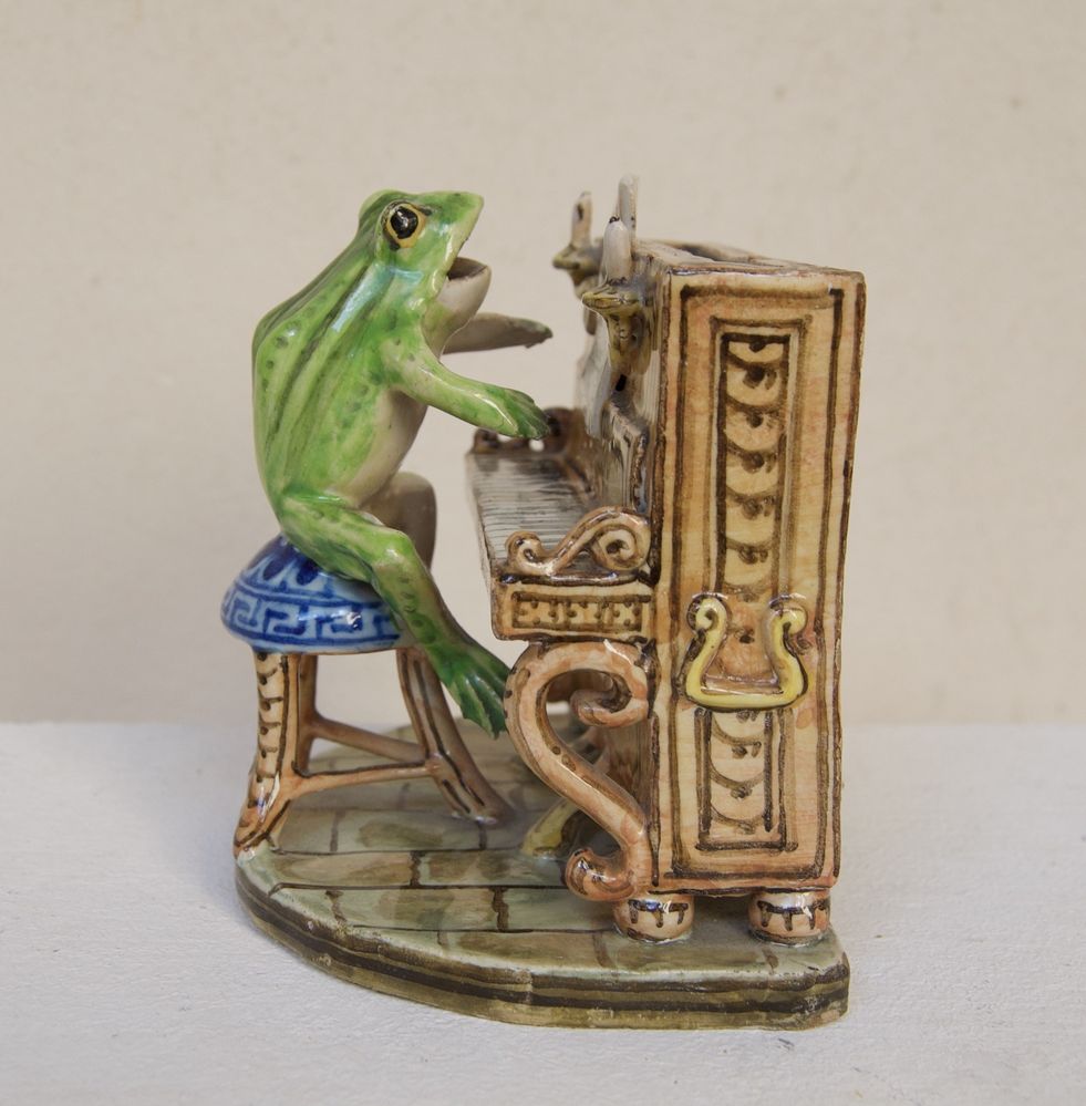MANIFATTURA ANGELO MINGHETTI, Bologna, inizi del XX secolo. Orchestra di rane. Scultura in maiolica policroma raffigurante rana che suona il pianoforte. Opera firmata al fronte AMF. Bibliografia: Lorenzo Lucchi, "Lo splendore delle maioliche Minghetti", Costa Editore, p. 148. Cm 10,5x11x9. (lievissimi difetti)