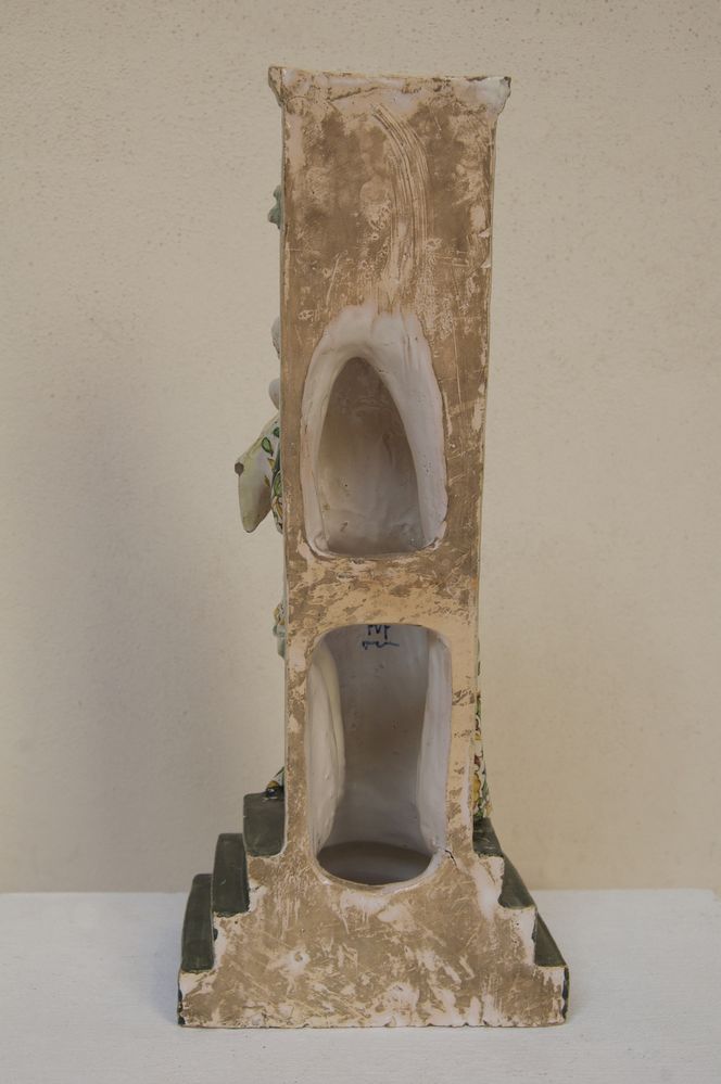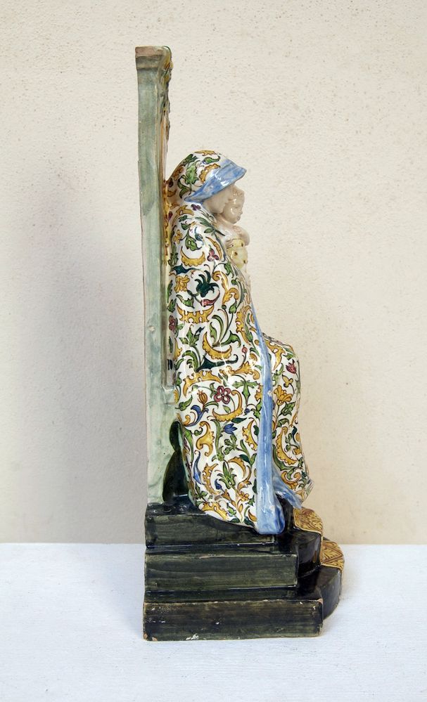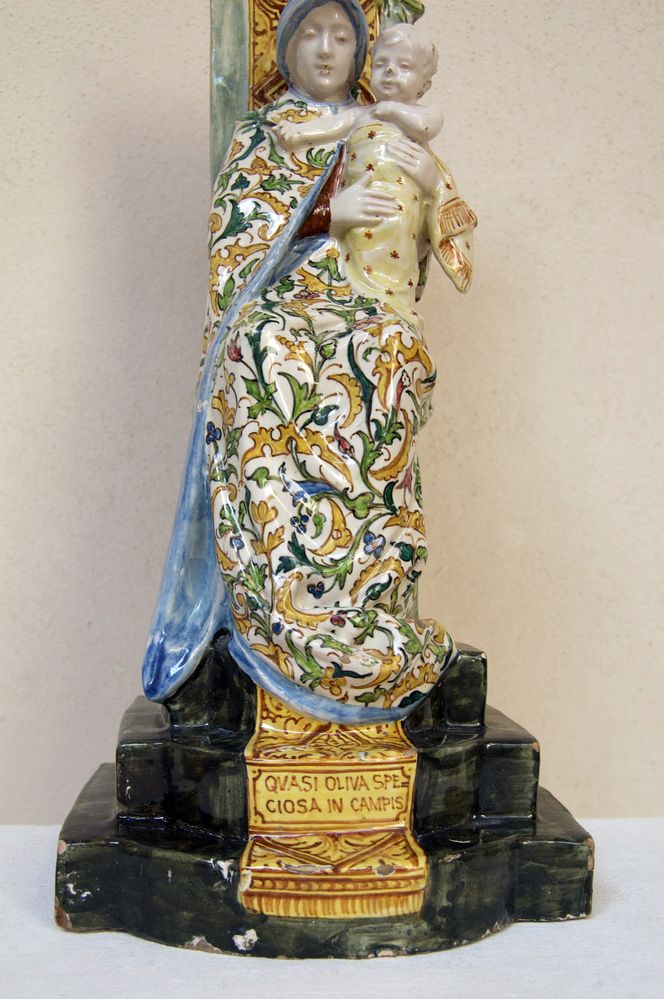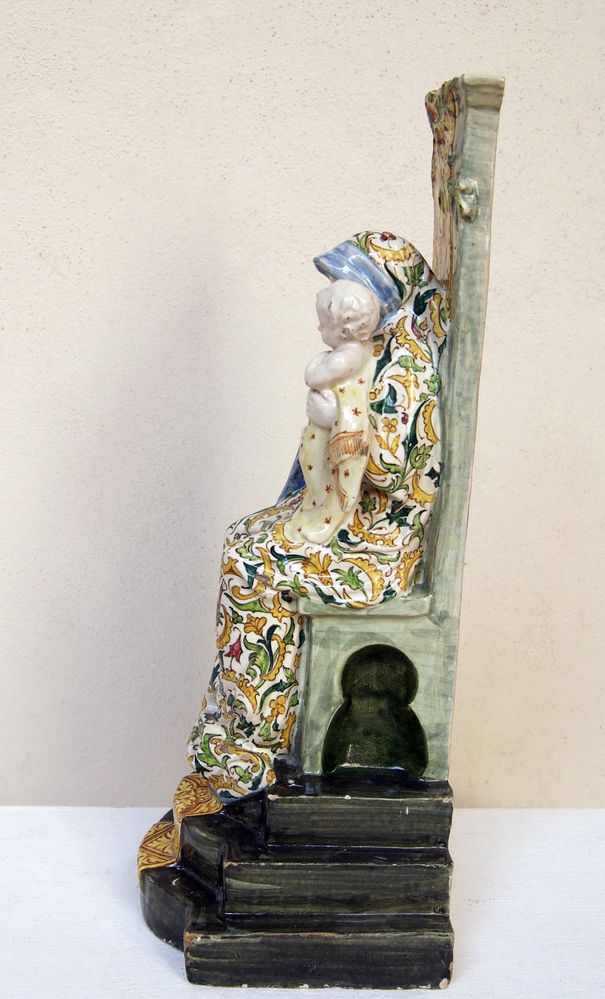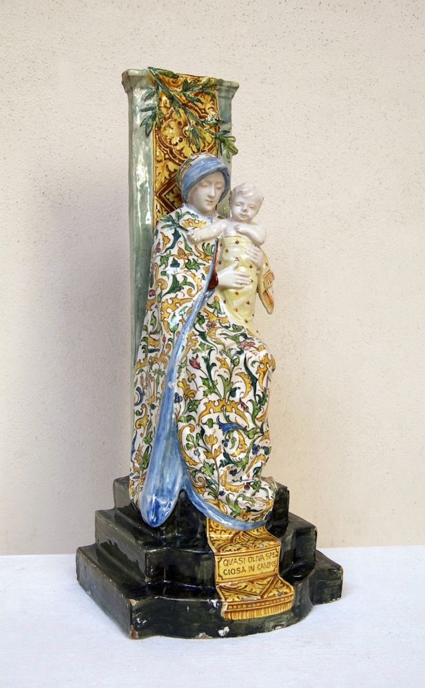 MANIFATTURA ANGELO MINGHETTI, Bologna, inizi del XX secolo. Scultura in maiolica policroma raffigurante Madonna con Bambino in trono. Reca iscrizione 'Quasi oliva speciosa in campis'. Opera firmata internamente al retro AMF. Bibliografia: Lorenzo Lucchi, "Lo splendore delle maioliche Minghetti", Costa Editore, p. 34. Cm 40x16x15. (lievissimi difetti)
