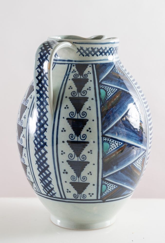 MELANDRI E FOCACCIA (Faenza 1922 - 1931) Grande brocca in ceramica policroma smaltata con decorazioni a motivi geometrici. Opera firmata sotto la base MF, Faenza, MF. Cm 33x23x23.