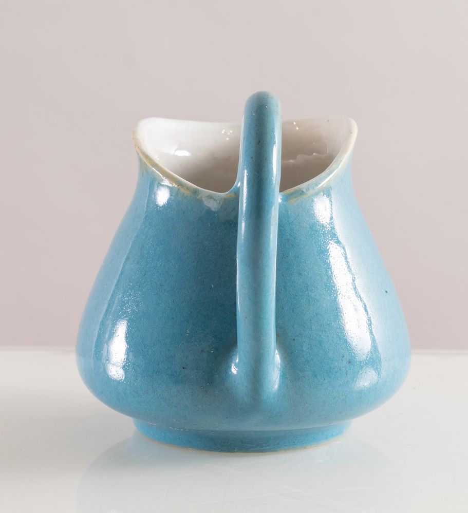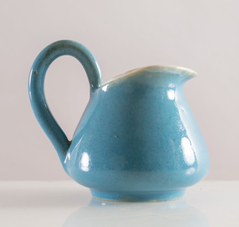 MELANDRI E FOCACCIA (Faenza 1922 - 1931) Piccola brocca in ceramica policroma smaltata sui toni dell'azzurro. Opera firmata sotto la base MF, Faenza, MF. Cm 9x10,5x8,5.
