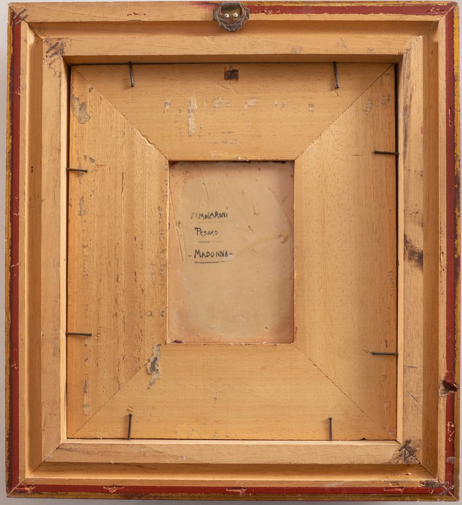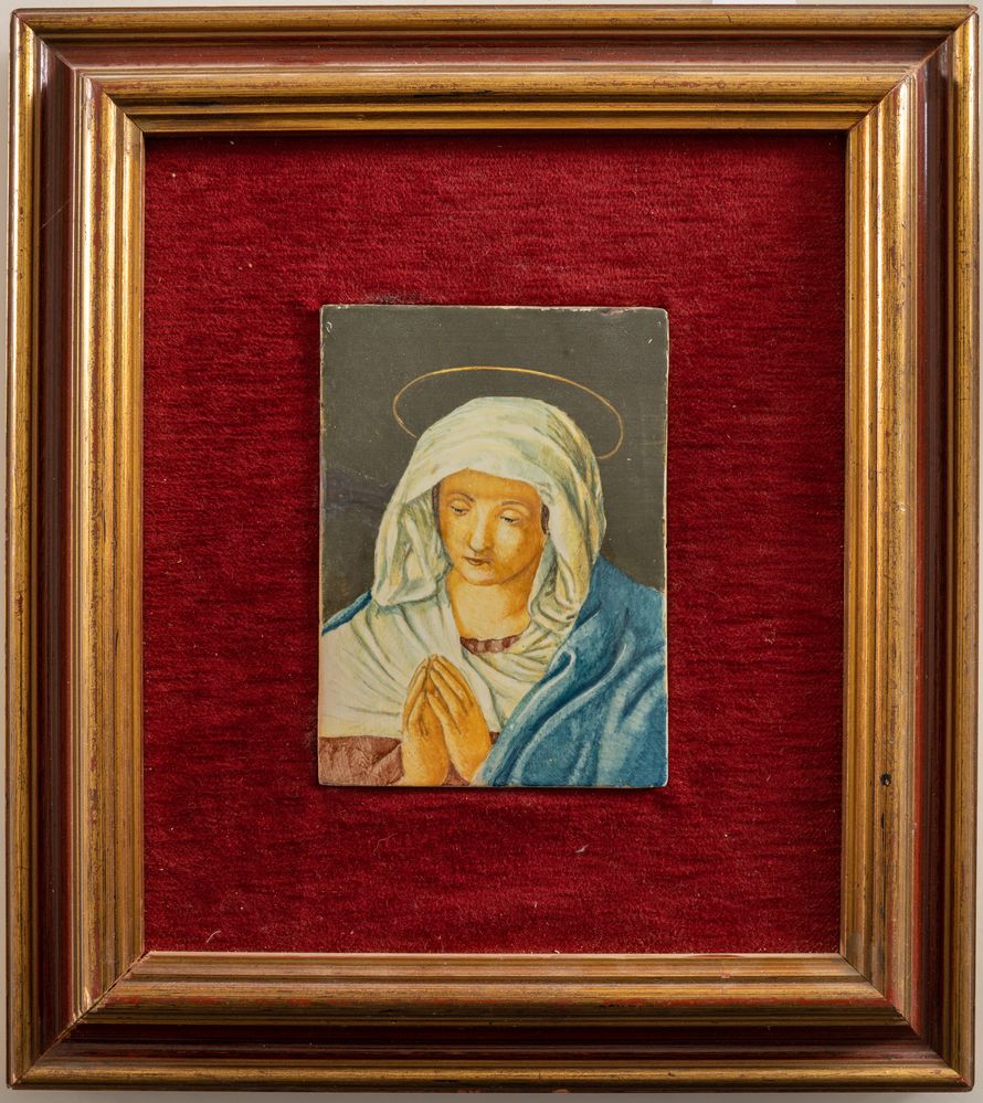FRANCESCO MOLARONI, Pesaro, prima metà del XX secolo. Placca in ceramica policroma smaltata raffigurante Madonna. Al retro reca firma F. Molaroni, Pesaro. Cm 15x11.