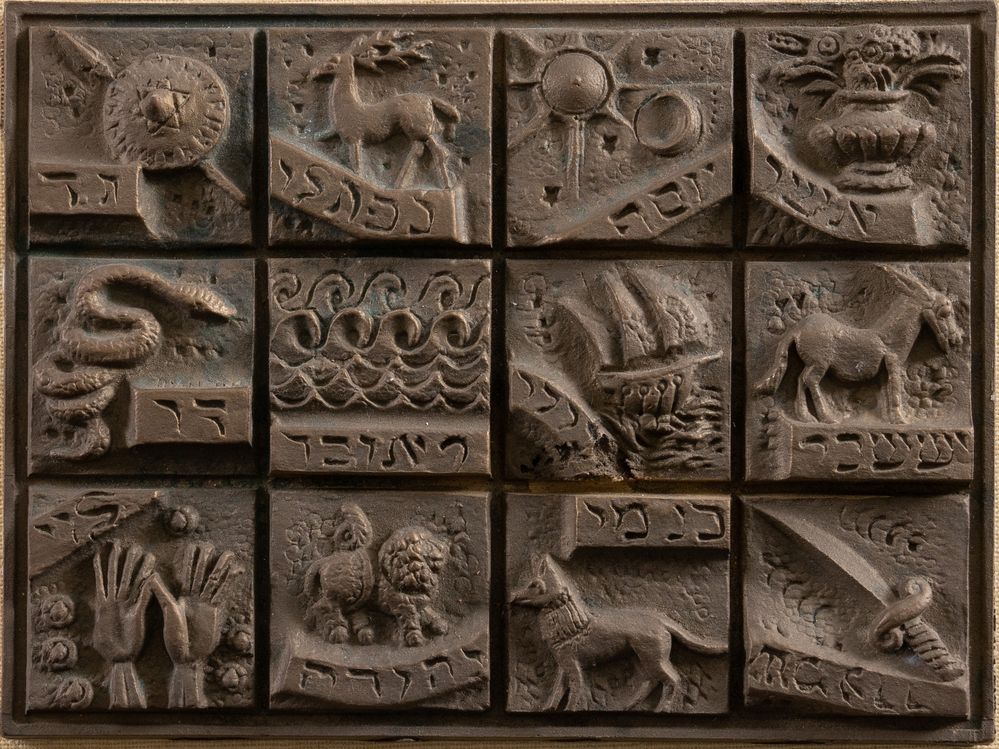 ANGELO BIANCINI (Castelbolognese 1911 - 1988) "Simboli delle dodici tribù ebraiche”. Placca in bronzo. Seconda metà del XX secolo. Cm 14x19.