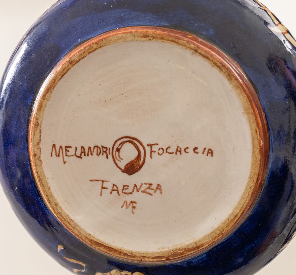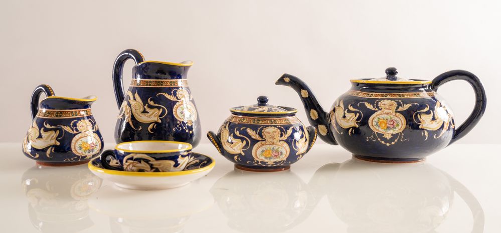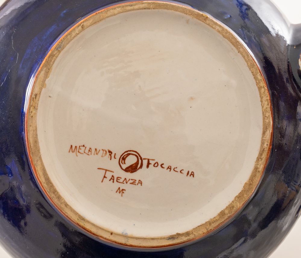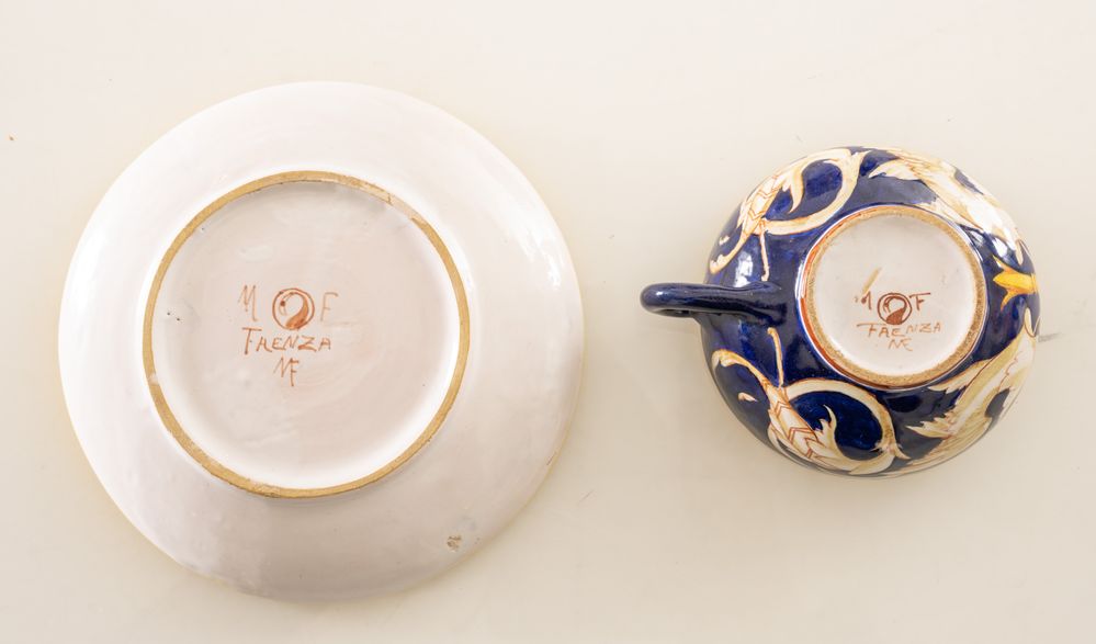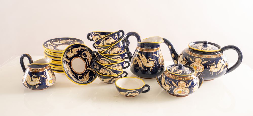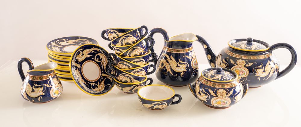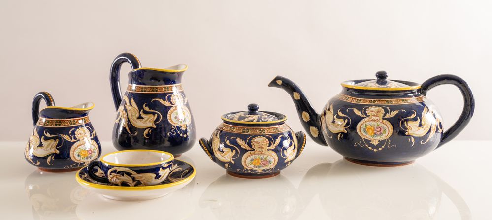 MELANDRI E FOCACCIA (Faenza 1922 - 1931) Servizio da te da dieci persone, composto da 10 tazzine, 10 piattini, teiera, zuccheriera, lattiera e una brocca in ceramica policroma smaltata. Recano decorazione a grottesche su fondo blu. Opere firmate sotto la base MF, Faenza, MF.