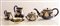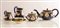MELANDRI E FOCACCIA (Faenza 1922 - 1931) Servizio da te da dieci persone, composto da 10 tazzine, 10 piattini, teiera, zuccheriera, lattiera e una brocca in ceramica policroma smaltata. Recano decorazione a grottesche su fondo blu. Opere firmate sotto la base MF, Faenza, MF.