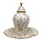 Poutiche con sottopiatto in porcellana Lindner Bavaria, 20° secolo h complessiva 35 cm con decorazioni floreali. Marchio alla base. Piccola mancanza all'impugnatura del coperchio.