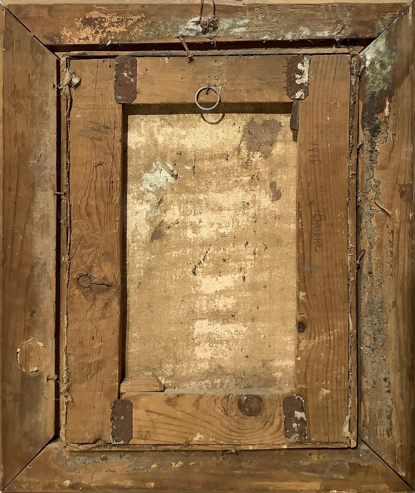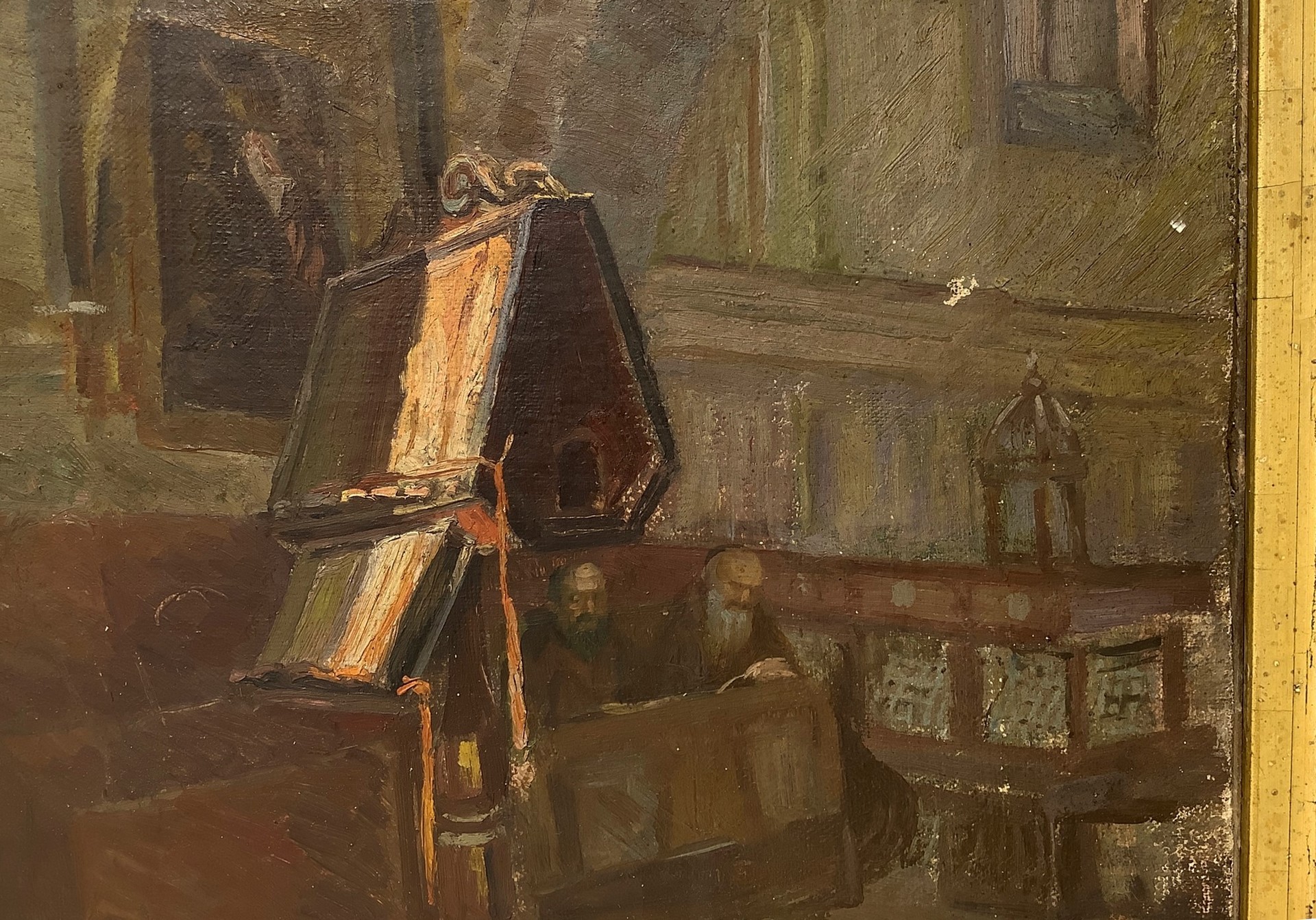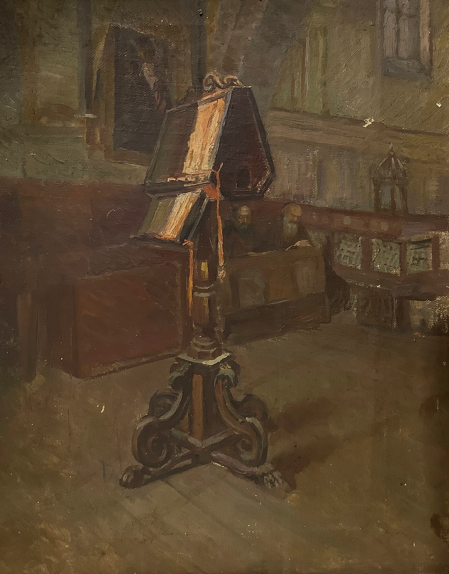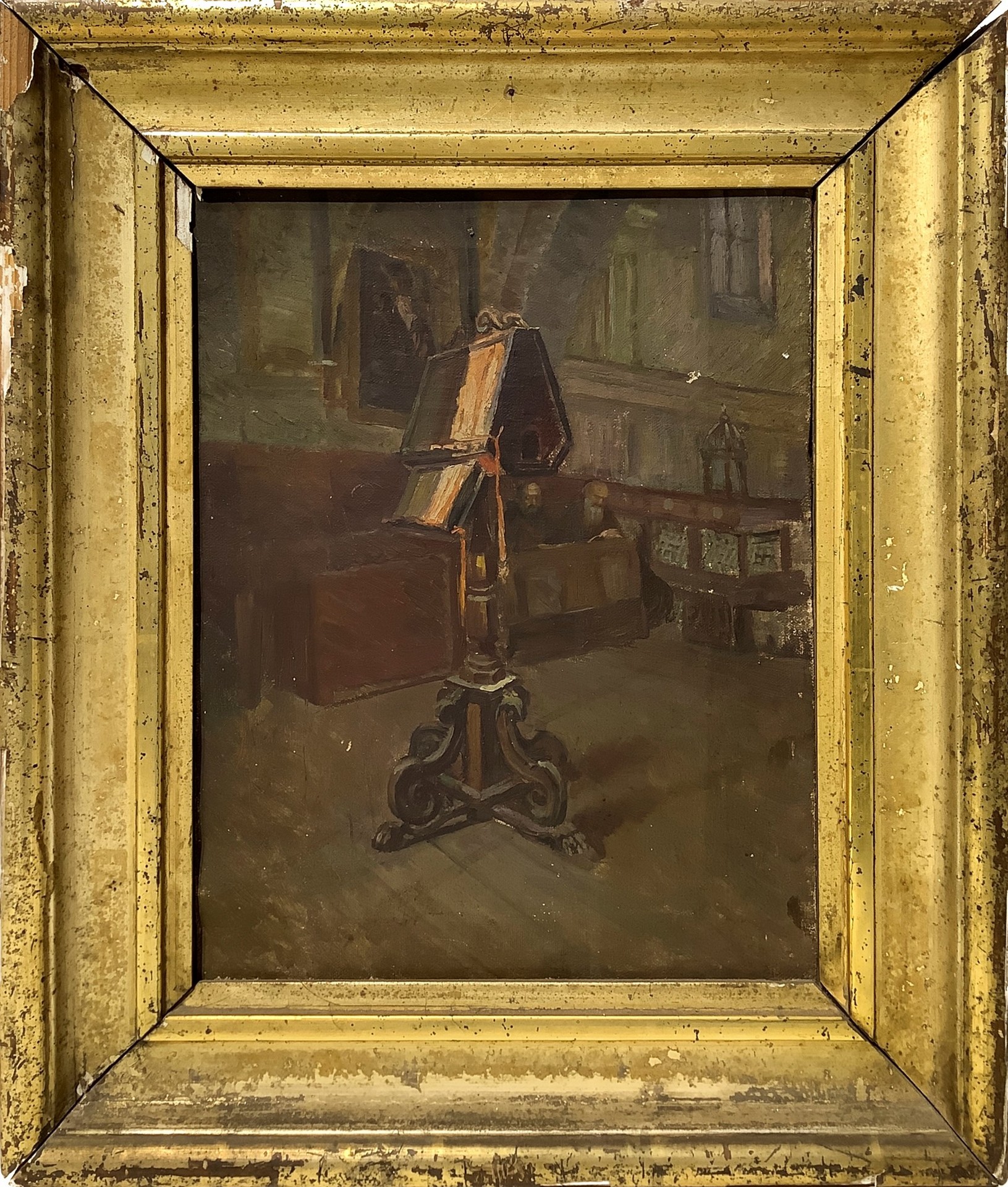 Barone Giuseppe (Militello in Val di Catania 2 ottobre 1887-Catania 3 gennaio 1956) - Leggio da terra all'interno di una chiesa, 1916 H cm 37,5x28, in cornice h cm 48x41 Olio su tela Firmato sul retro.