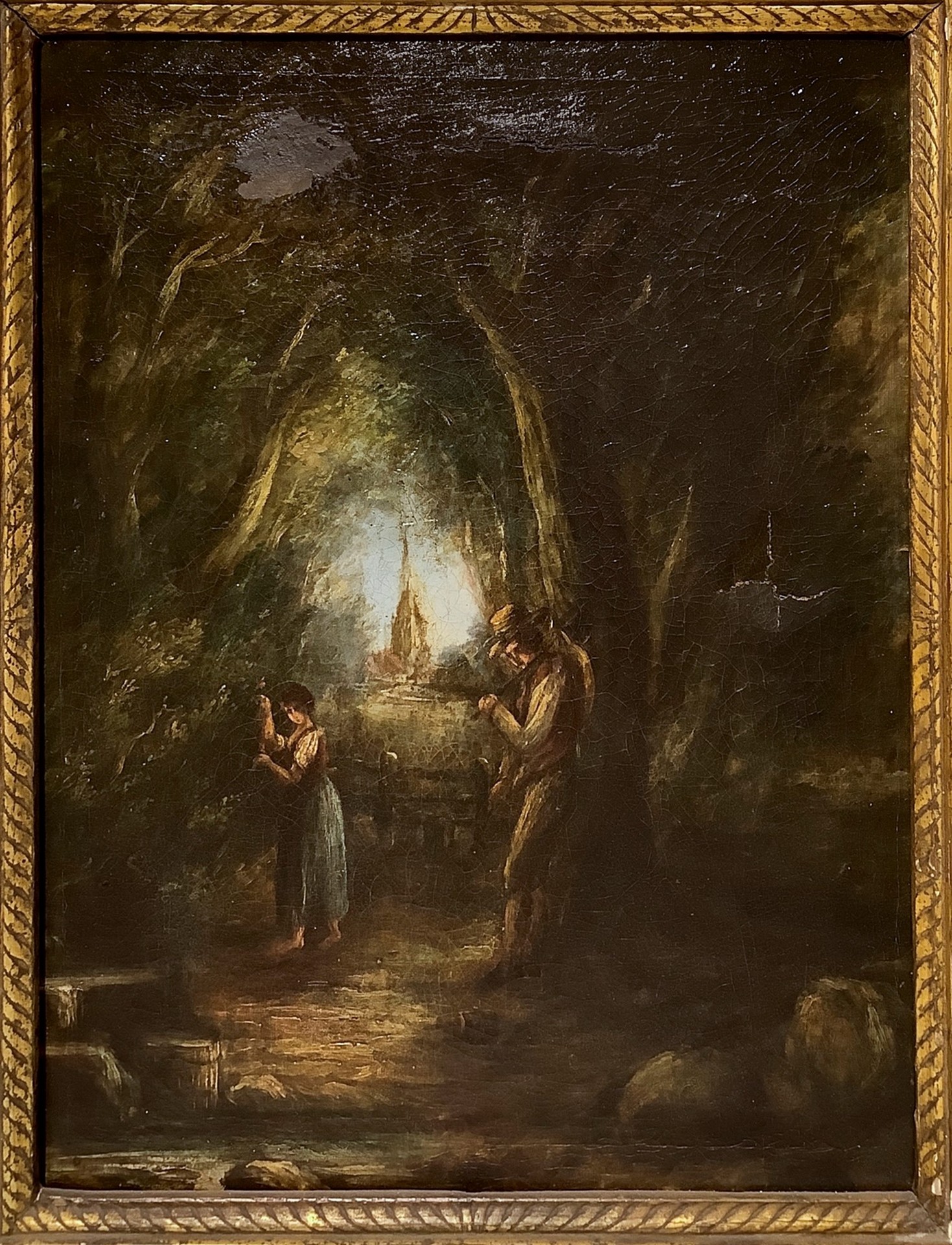 Dipinto raffigurante giovani personaggi in un bosco in cornice antica di legno dorata, Nineteen° secolo