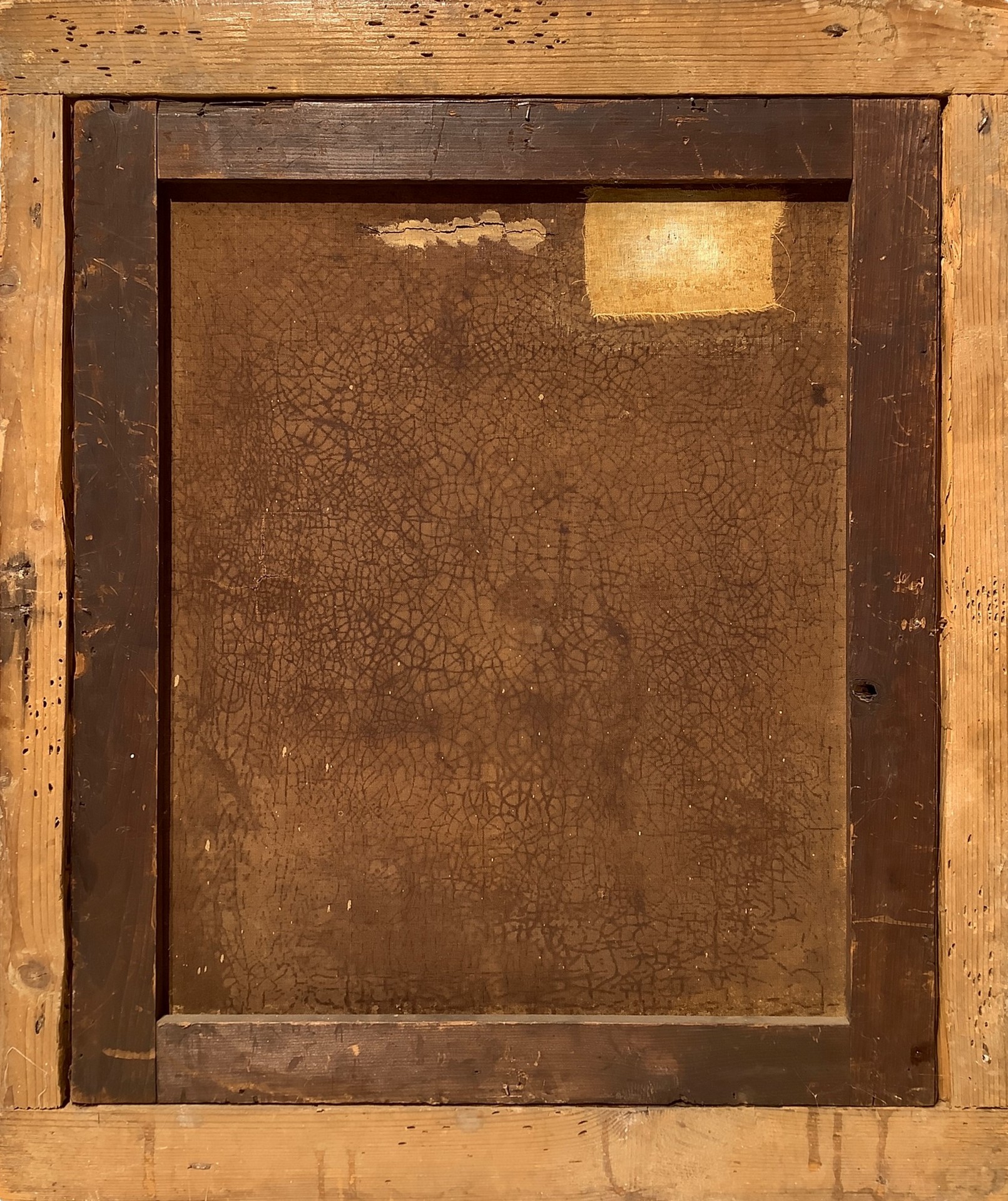 Dipinto raffigurante giovani personaggi in un bosco in cornice antica di legno dorata, Nineteen° secolo H 61x51, in cornice 73,5x60 Olio su tela Pittore della fine del XIX Secolo; tela da restaurare;