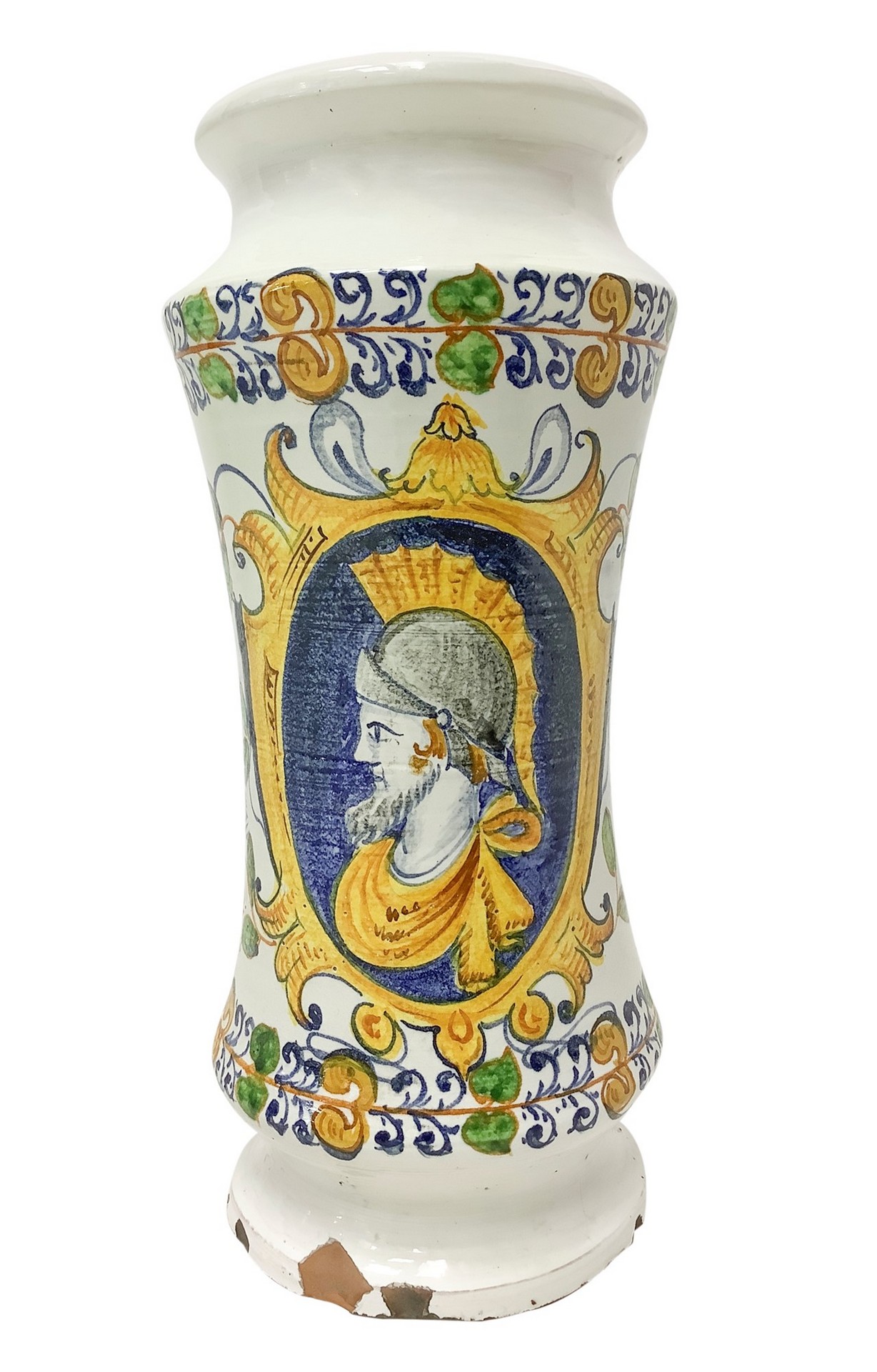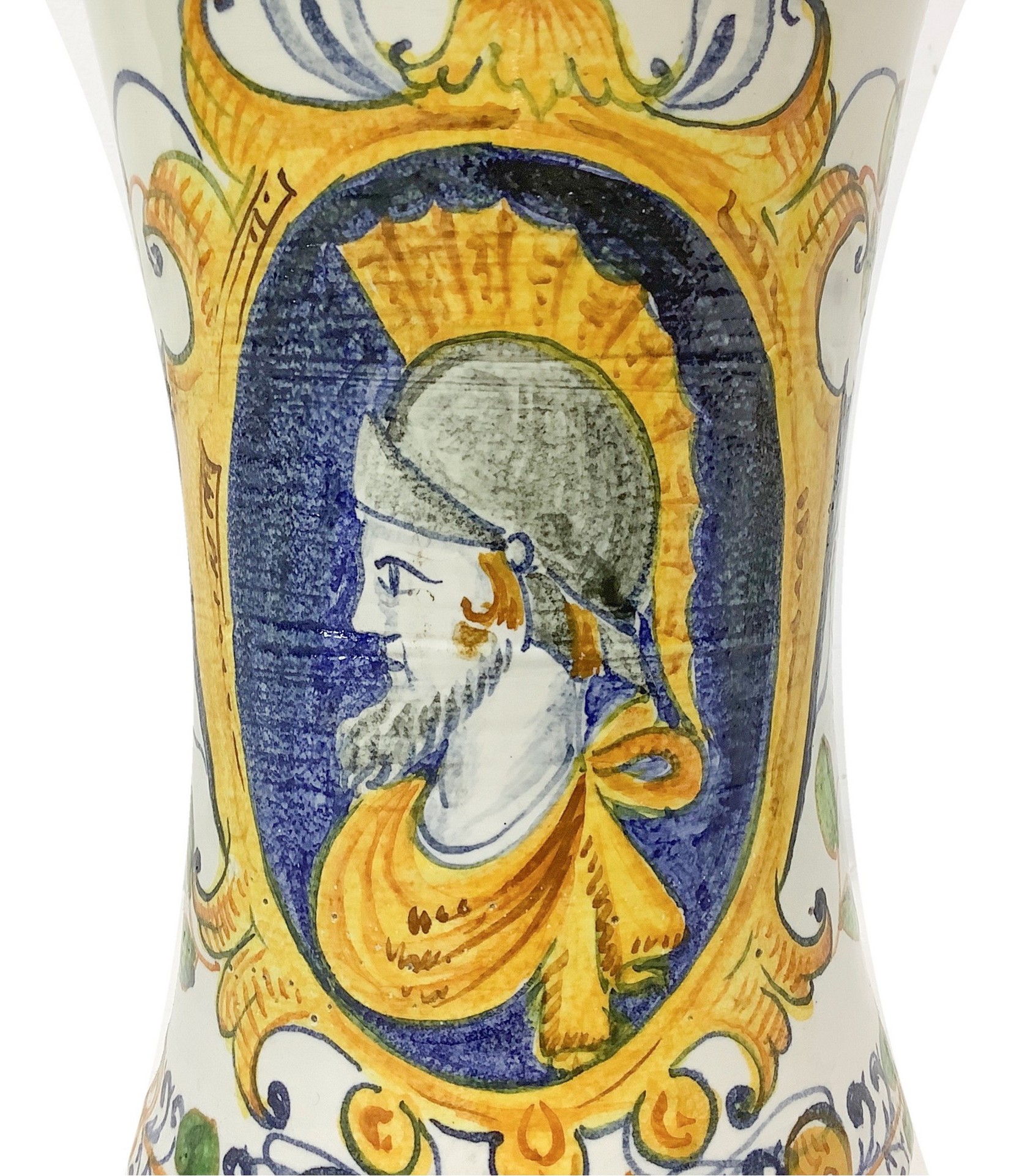 Coppia di albarelli in maiolica policroma con personaggio sul davanti su base bianca, 20° secolo h cm 30