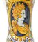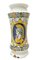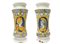 Coppia di albarelli in maiolica policroma con personaggio sul davanti su base bianca, 20° secolo h cm 30