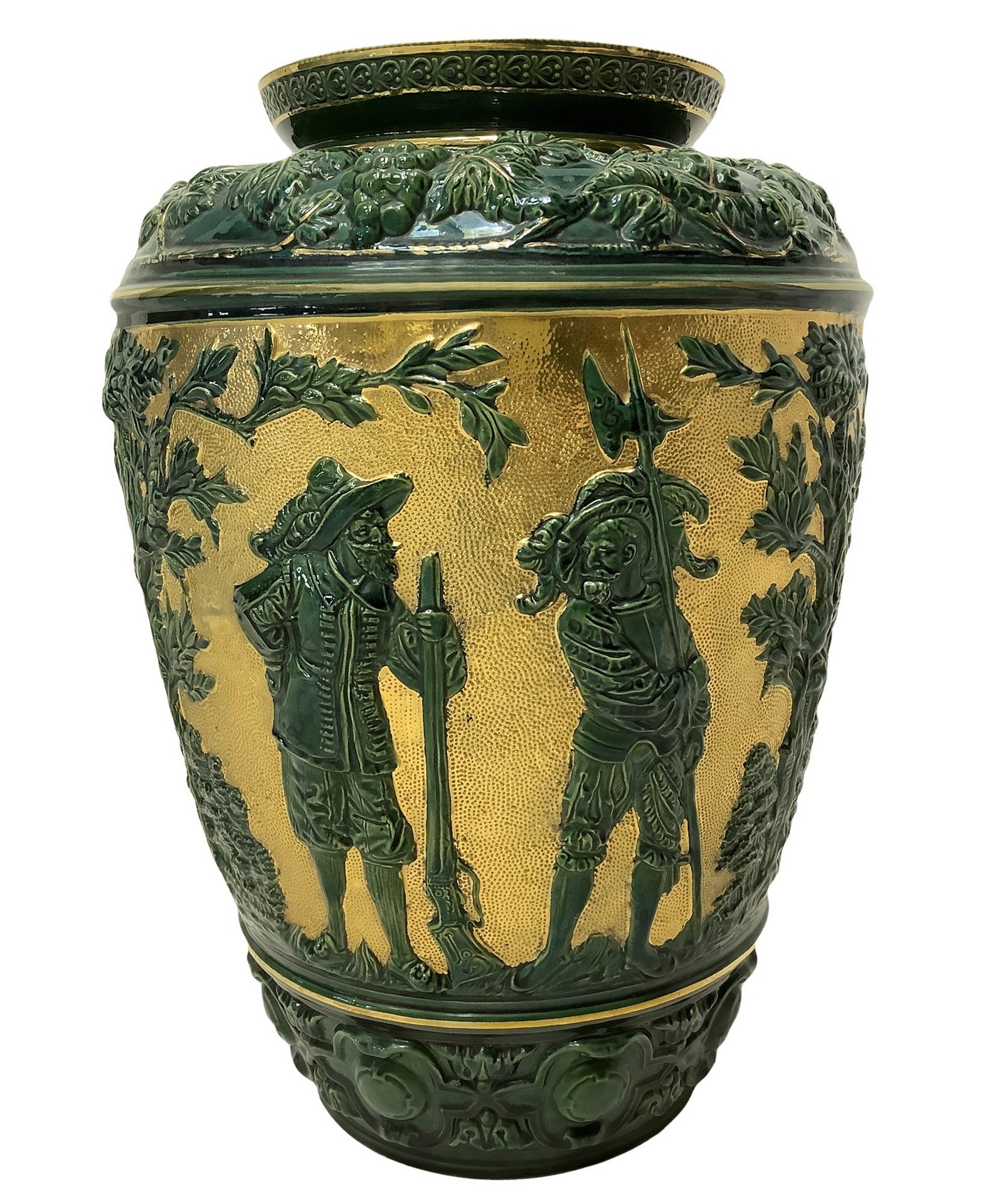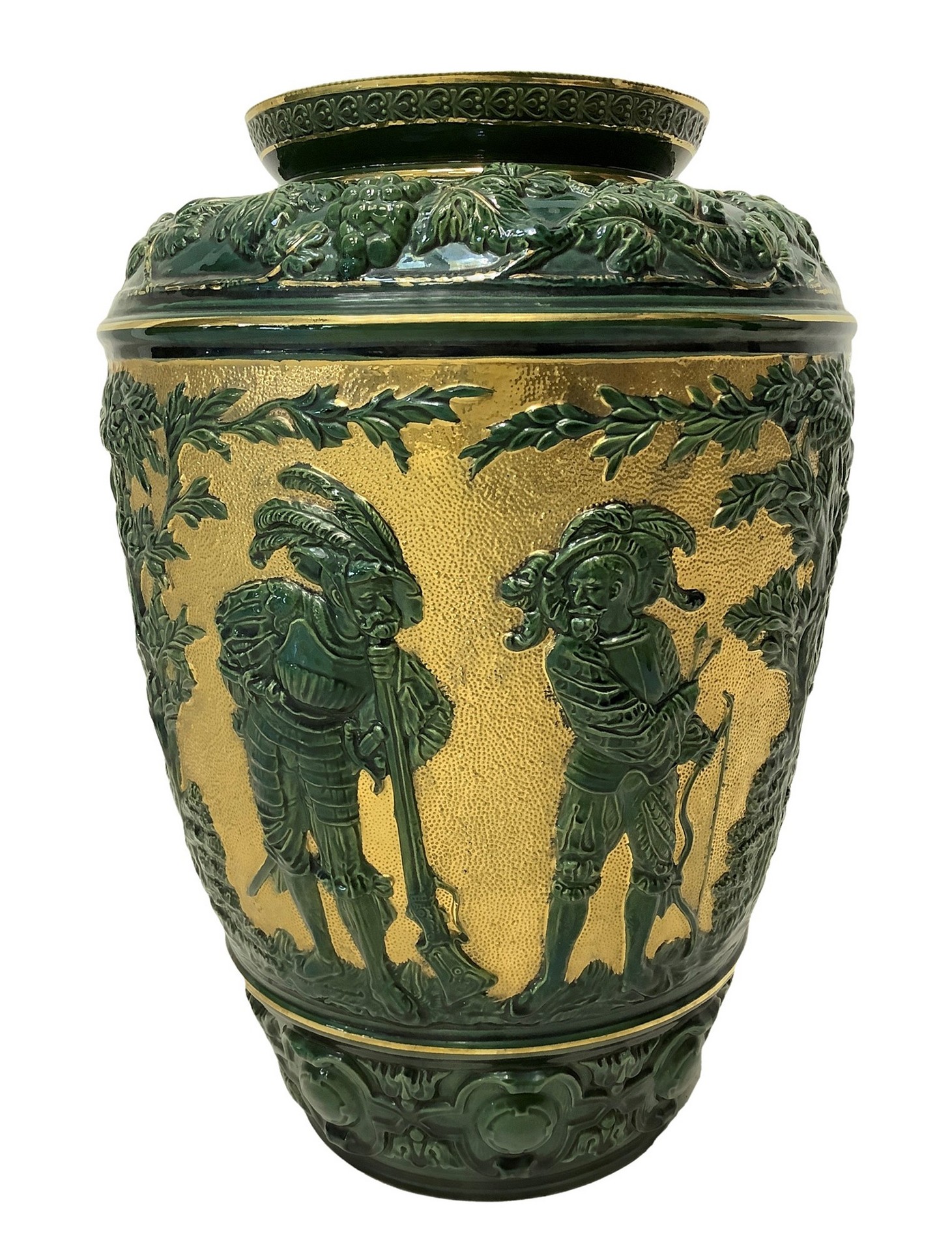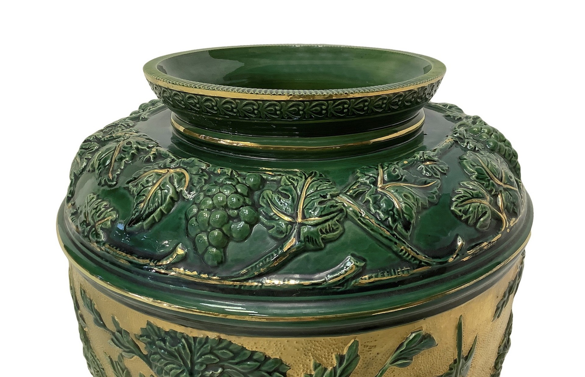 Vaso in maiolica verde e oro con raffigurazione di tralci d'uva e personaggi, 20° secolo h cm 38; diametro cm 27